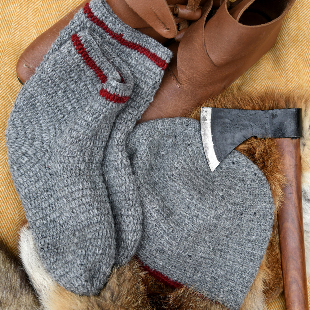 Diese schönen grau-weinroten Socken sind nicht nur ein echter Hingucker, sondern bieten dir auch optimalen Schutz vor der Kälte. Die Wollsocken sind ideal für LARP, Reenactment und den Mittelaltermarkt und die perfekte Ergänzung für deine Mittelalter Kleidung oder Wikinger Gewandung.