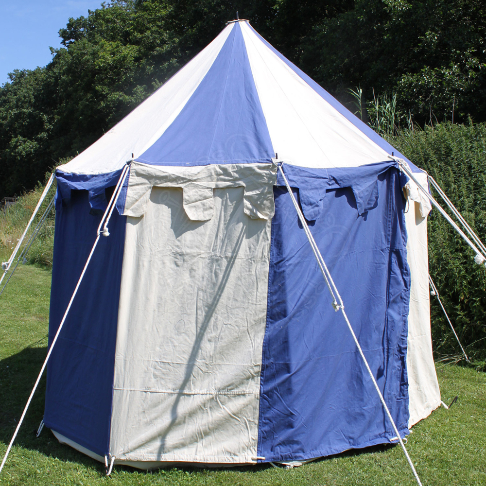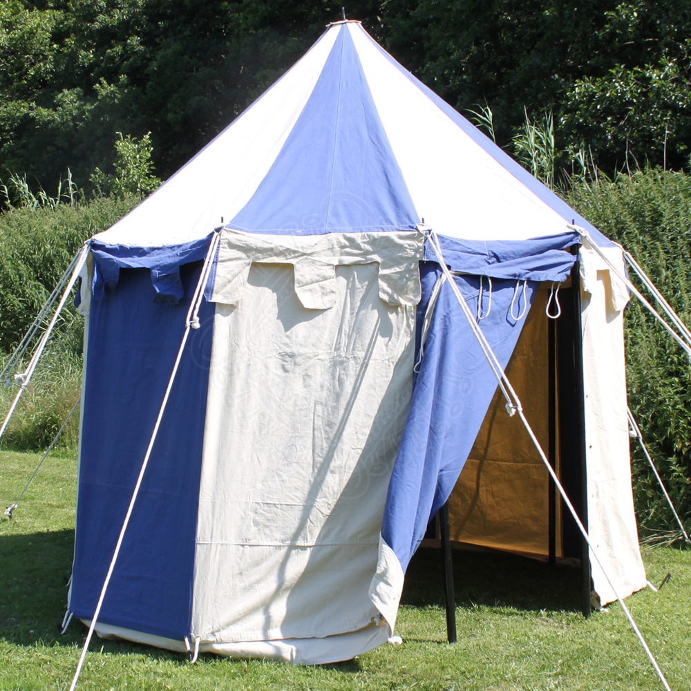 Mit dem schlichten Mittelalterzelt Johann bekommst Du ein preisgünstiges, aber geräumiges und funktionales Zelt für Heerlager, Mittelaltermärkte oder LARP. Es bietet 2 Personen nebst Gepäck und Ausrüstung genügend Platz und mit ca. 1,80 m Seiten- und ca. 3 m Mittelhöhe ausreichend Kopffreiheit auch für größere Recken. Das Ritterzelt wird umlaufend von einer Schabracke verziert. Am unteren Rand ist ein Wind- und Schmutzfang angebracht. Weitere Produktinformationen ...