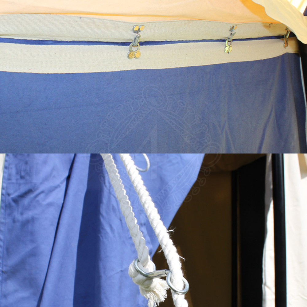 Die separate Seitenwand lässt sich einfach in das Dach mit Häkchen einhängen. Ohne Seitenwand kannst Du das mittelalterliche Zelt als Baldachin nutzen. Um das Zelt kompakt zu halten, haben wir auf ein Vordach verzichtet.