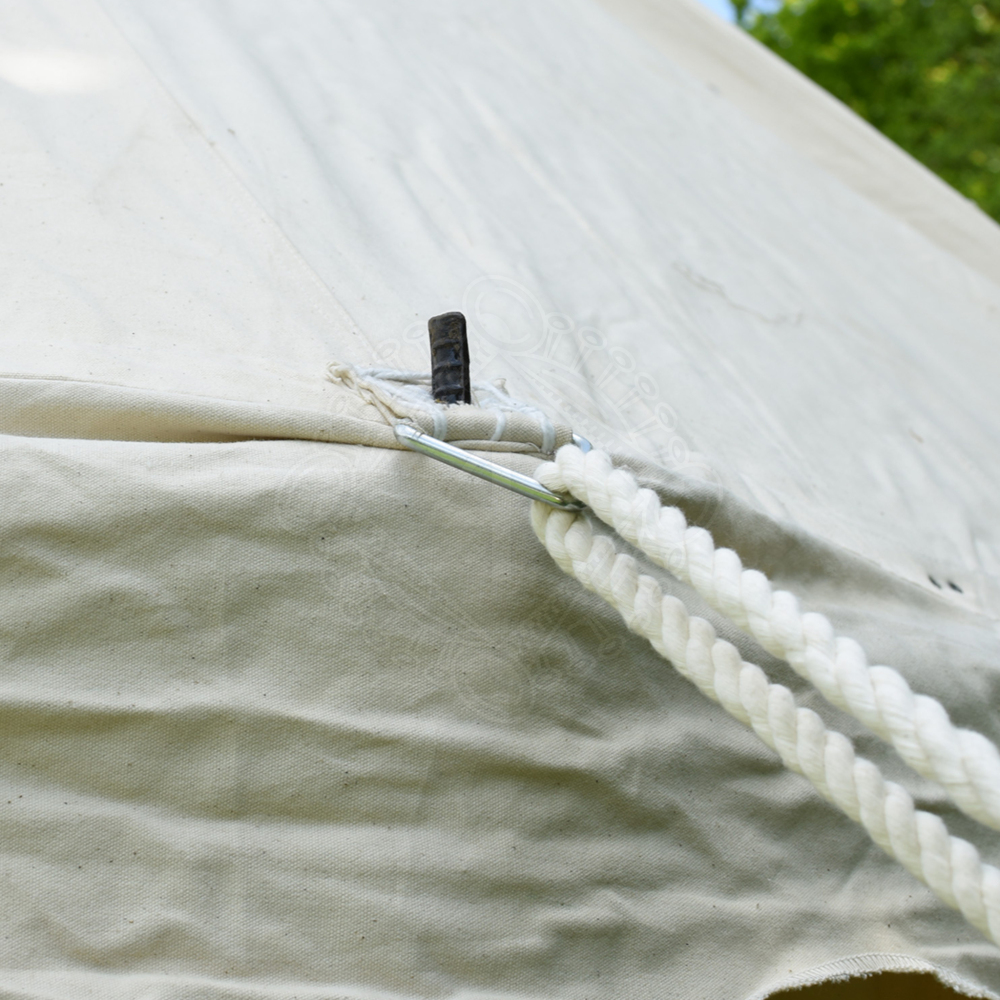 Die separate Seitenwand lässt sich einfach in das Dach mit Häkchen einhängen. Ohne Seitenwand kannst Du das mittelalterliche Zelt als Baldachin nutzen. Um das Zelt kompakt zu halten, haben wir auf ein Vordach verzichtet.