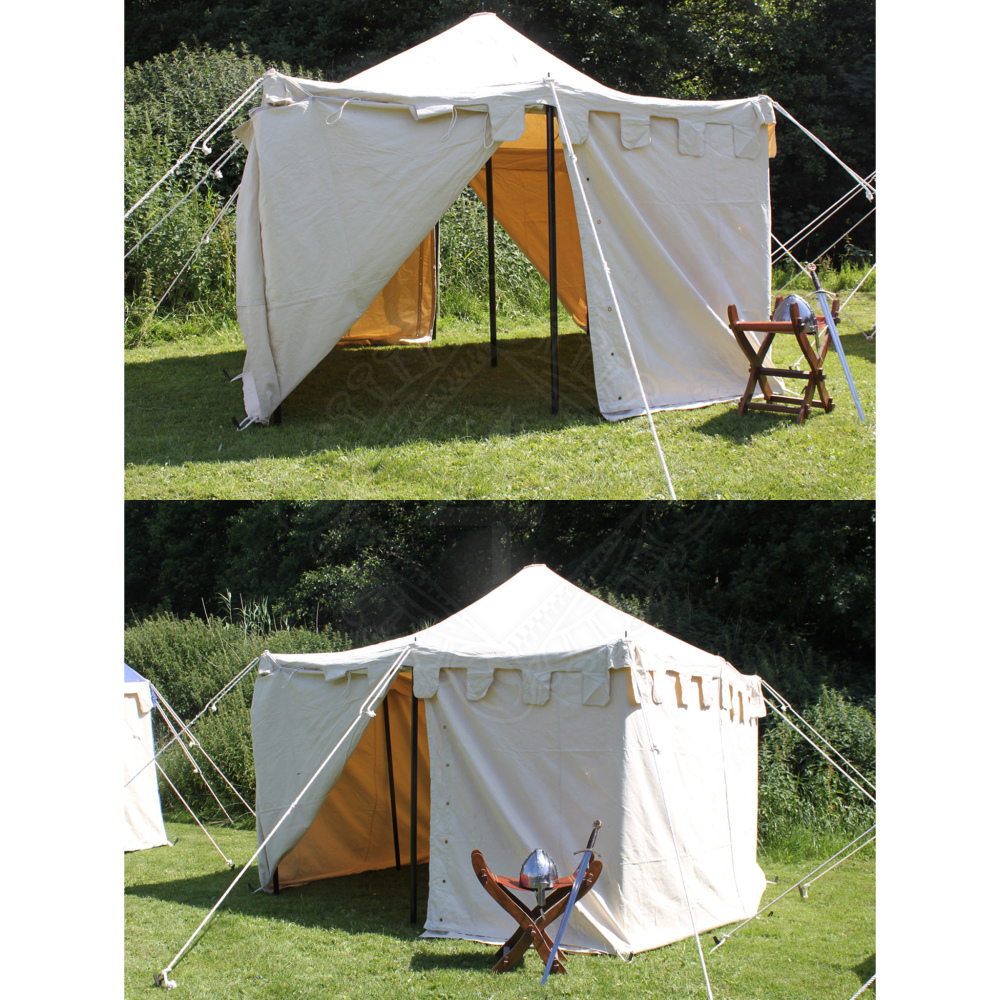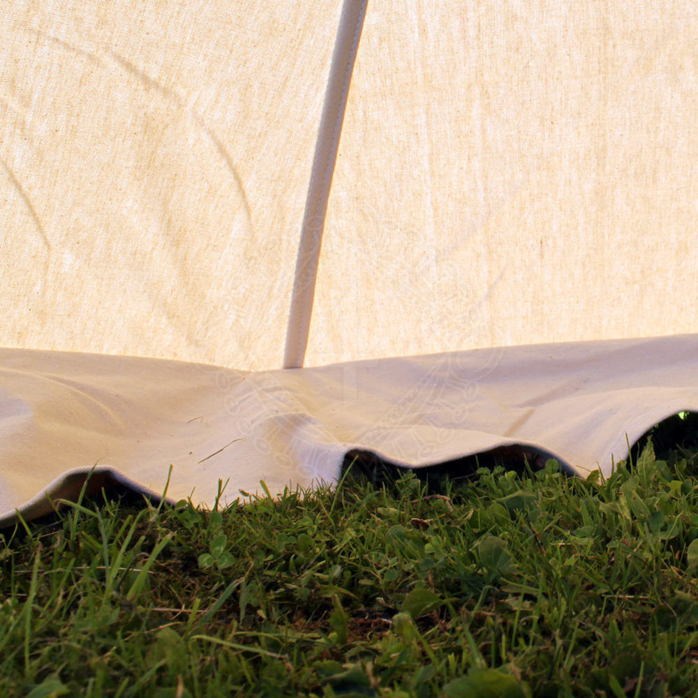 Mit dem schlichten Mittelalterzelt Herold bekommst Du ein preisgünstiges, aber geräumiges und funktionales Zelt für Heerlager, Mittelaltermärkte oder LARP. Es bietet bis zu 4 Personen nebst Gepäck und Ausrüstung genügend Platz und mit ca. 1,90 m Seiten- und ca. 3 m Mittelhöhe ausreichend Kopffreiheit auch für größere Recken. Das Ritterzelt wird umlaufend von einer Schabracke verziert. Am unteren Rand ist ein Wind- und Schmutzfang angebracht. Durch die beiden geteilten Seitenwände lässt sich das mittelalterliche Zelt vorn und hinten öffnen. Ohne Seitenwände kannst Du das Zelt als Baldachin nutzen. Um das Zelt kompakt zu halten, haben wir auf ein Vordach verzichtet. Weitere Produktinformationen ...
