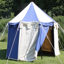 Mit dem schlichten Mittelalterzelt Herold bekommst Du ein preisgünstiges, aber geräumiges und funktionales Zelt für Heerlager, Mittelaltermärkte oder LARP. Es bietet bis zu 5 Personen nebst Gepäck und Ausrüstung genügend Platz und mit ca. 1,90 m Seiten- und ca. 3 m Mittelhöhe ausreichend Kopffreiheit auch für größere Recken. Das Ritterzelt wird umlaufend von einer Schabracke verziert. Am unteren Rand ist ein Wind- und Schmutzfang angebracht. Durch die beiden geteilten Seitenwände lässt sich das mittelalterliche Zelt vorn und hinten öffnen. Ohne Seitenwände kannst Du das Zelt als Baldachin nutzen. Um das Zelt kompakt zu halten, haben wir auf ein Vordach verzichtet. Weitere Produktinformationen ...