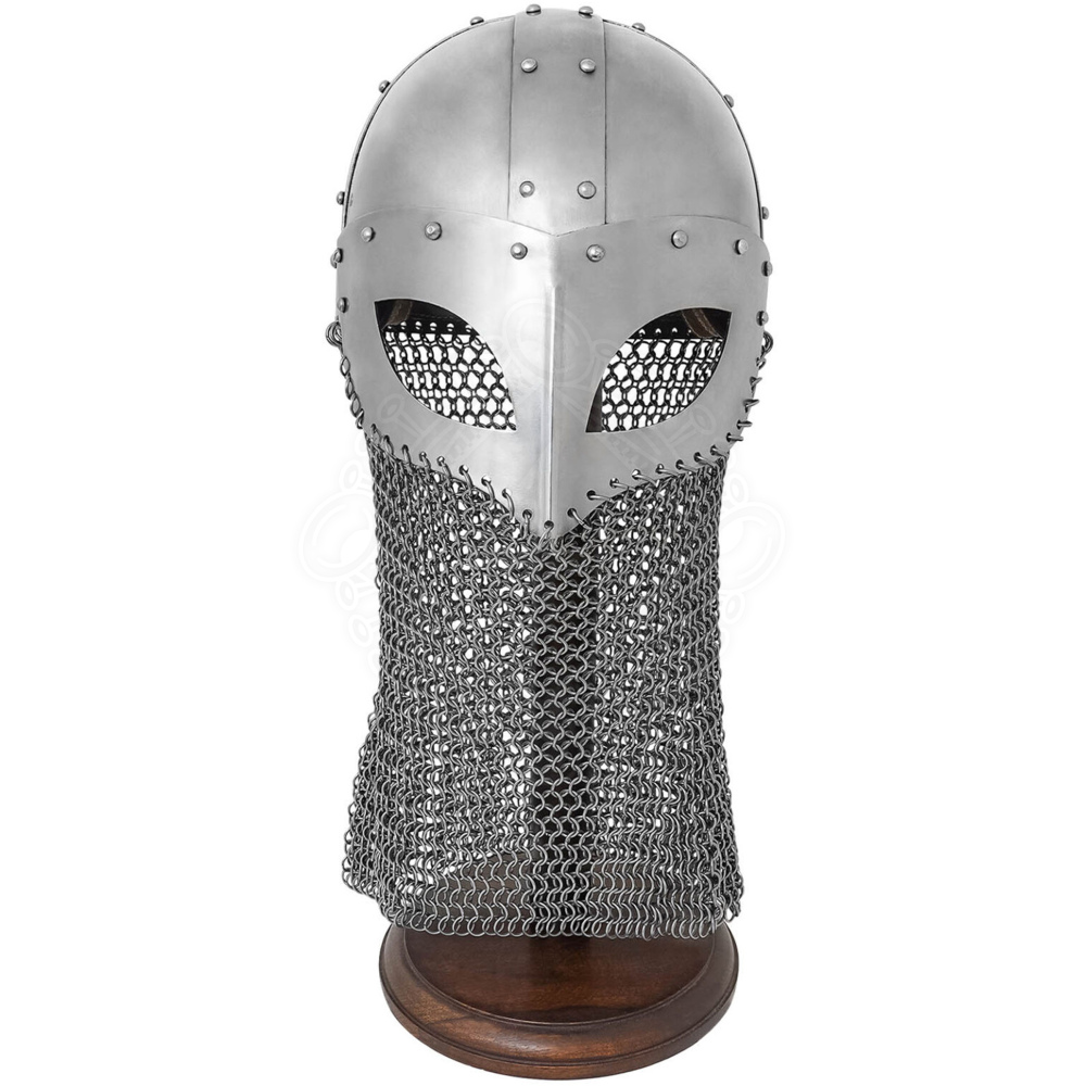 Brillenhelme waren typisch für die Wikingerzeit, insbesondere vom 8. bis zum 11. Jahrhundert. Sie entwickelten sich aus früheren Helmtypen und ihr charakteristisches Merkmal war der Augen- und Nasenschutz aus einer Metallplatte, die an eine Brille oder Maske erinnerte. Diese Konstruktion bot einen besseren Gesichtsschutz als einfache konische Helme, ohne das Sichtfeld oder die Atmung wesentlich einzuschränken. Oft wurden sie durch eine Kettenbrünne ergänzt, die Hals und Schultern schützte. Sie waren ein Symbol für Status und militärische Macht der Wikingerkrieger.