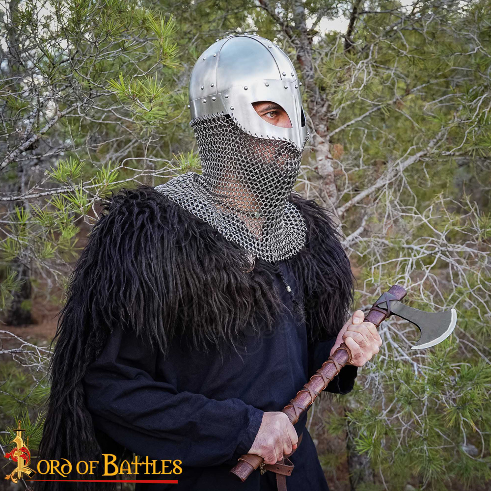 Wikinger Brillenhelm mit Gestoßener Kettenbrünne: Dieser funktionale Wikinger Brillenhelm der renommierten Marke Lord Of Battles repräsentiert höchste Handwerkskunst und historische Genauigkeit. Er ist handgefertigt aus robustem 1,6 mm (16 Gauge) Weichstahl mit polierter Oberfläche und wird durch eine angenietete, gestoßene Kettenbrünne (Helmbrünne) aus 10 mm Ringen (1,6 mm Drahtstärke) ergänzt. Mit diesem Helm fällst du garantiert bei jedem LARP-Event, Mittelaltermarkt oder Reenactment auf und verleihst deinem Wikinger-Charakter ein authentisches und furchteinflößendes Aussehen. Weitere Produktinformationen ...