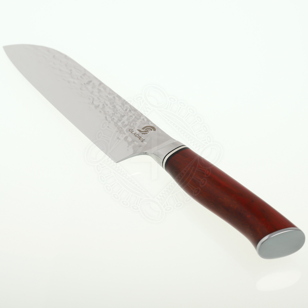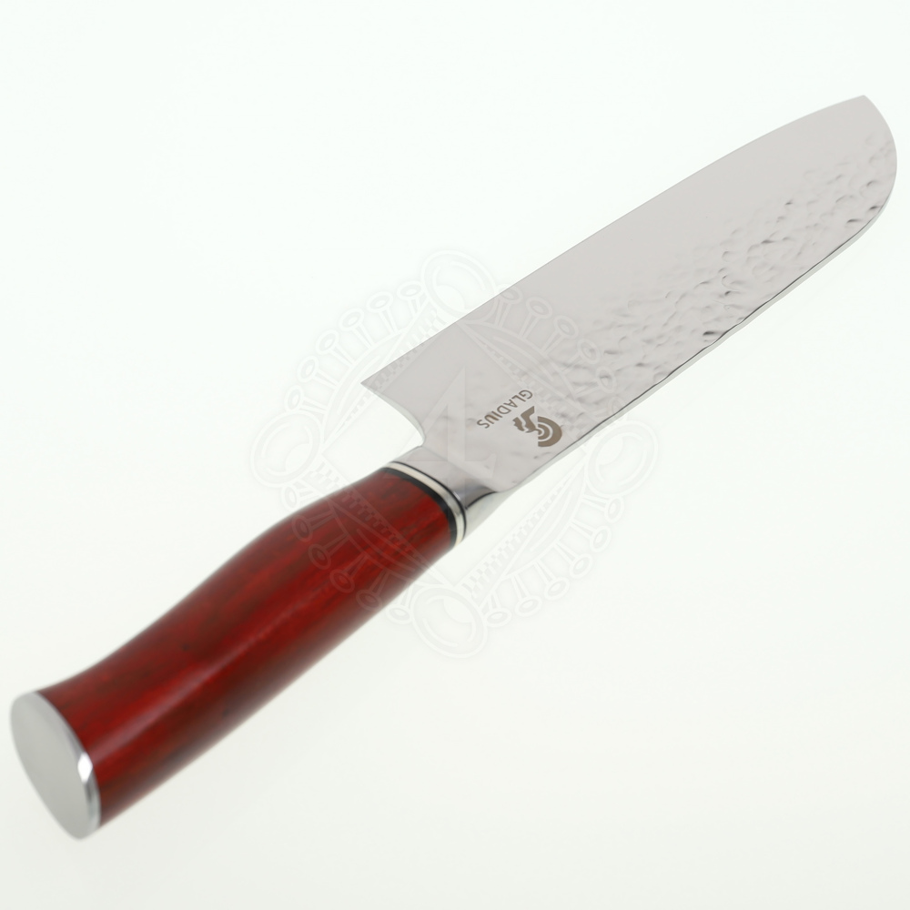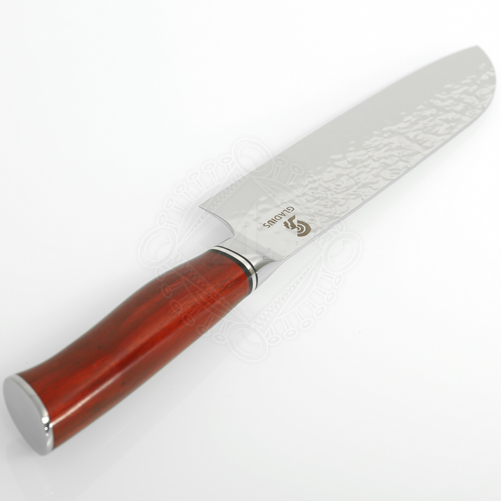 Das Messer hat die typische Santoku-Form – eine breite Klinge mit einer Länge von ca. 190 mm, die sich zur Spitze hin in einem charakteristischen Bogen absenkt ("Schafsfuß"-Form). Die Schneide ist relativ gerade, was das Hacken und Schubschnitte erleichtert. Die Klinge ist aus rostfreiem Edelstahl 440 gefertigt. Ähnlich wie beim Tranchiermesser dieser Serie gibt der Hersteller auch hier Hochglanzpolitur an, doch optisch fällt die Klinge durch eine markante gehämmerte Textur auf, die nicht nur gut aussieht, sondern auch das Anhaften von Lebensmitteln reduzieren kann. Das "GLADIUS"-Logo befindet sich nahe am Griff. Was dieses Santoku besonders macht, ist seine außergewöhnliche Klingenstärke von ca. 2,9 mm und das Gewicht von rund 227 g. Es ist ein wirklich robustes und kraftvolles Werkzeug. Der Griff aus rötlichem Sandelholz ist ergonomisch geformt und wird durch einen Metallkropf mit Zierringen ergänzt. Die Gesamtlänge des Messers beträgt ca. 315 mm.