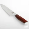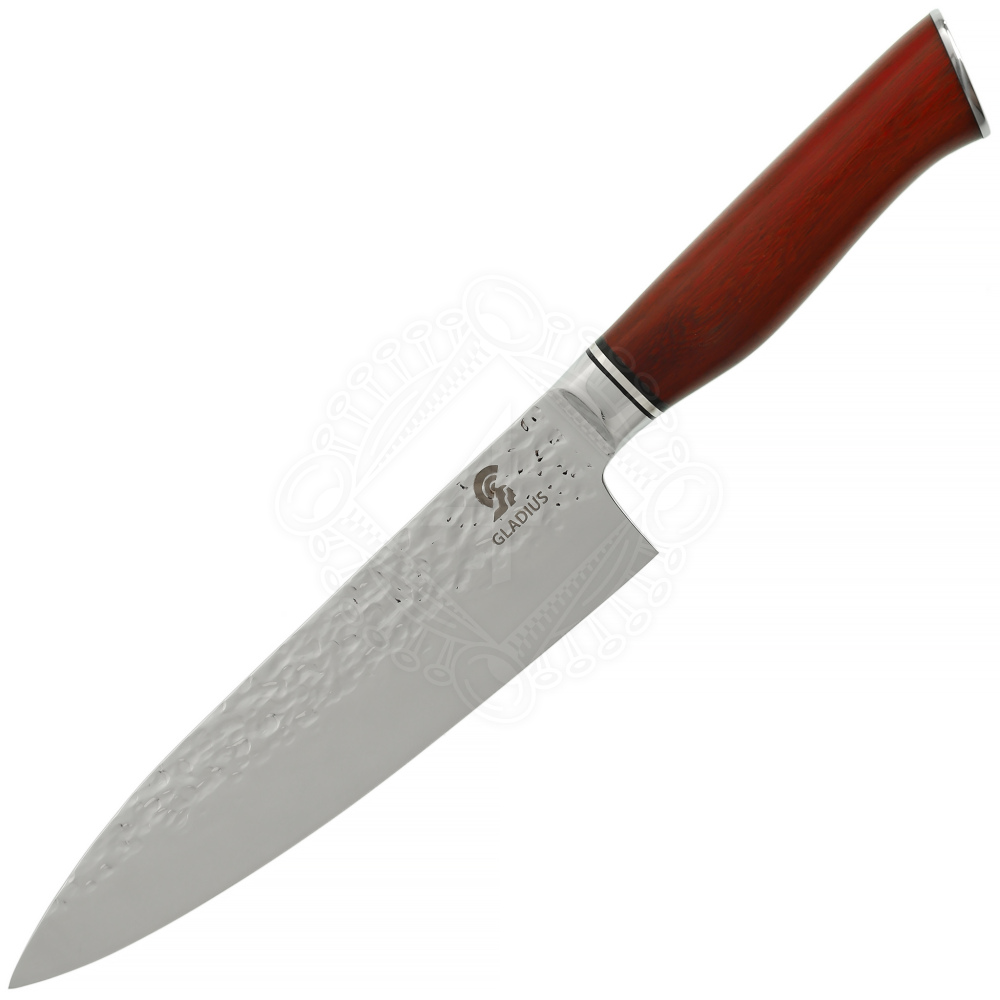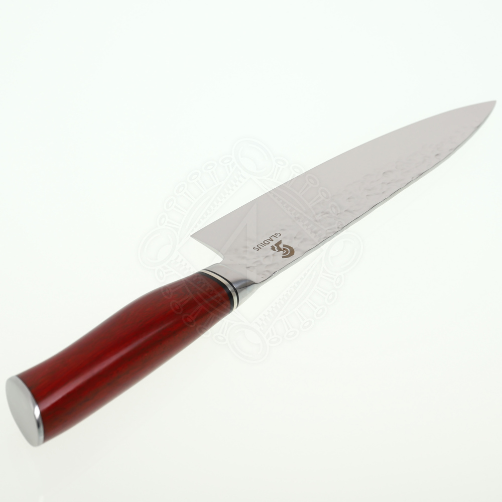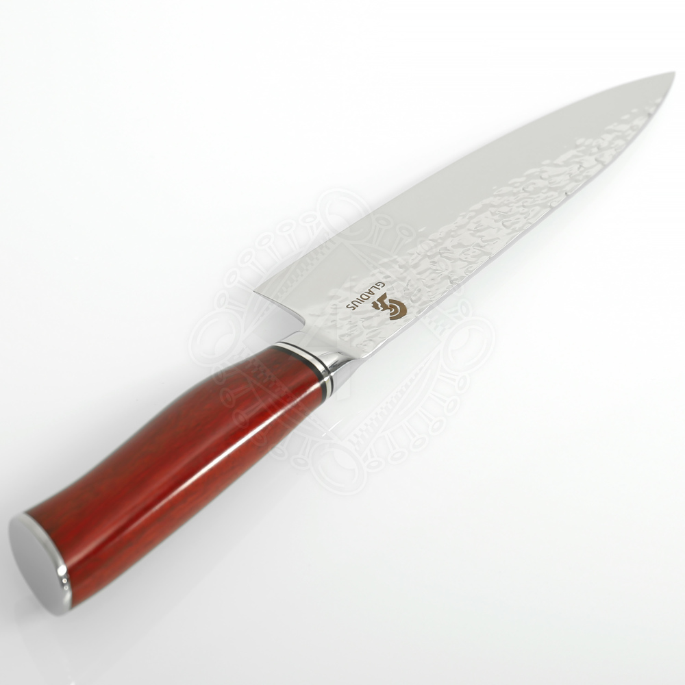 Das Messer hat das klassische Profil eines Kochmessers – eine dreieckige Klinge mit einer Länge von ca. 205 mm, die sich sanft zu einer scharfen Spitze verjüngt. Die leicht gebogene Schneide ermöglicht komfortables Schneiden im Wiegeschnitt. Die Klinge ist aus rostfreiem Edelstahl 440 gefertigt. Wie bei anderen Messern dieser Serie gibt der Hersteller auch hier Hochglanzpolitur an, jedoch fällt die Klinge sofort durch ihre markante gehämmerte Textur auf, die ihr ein einzigartiges Aussehen verleiht und das Anhaften von Schnittgut verringern kann. Das "GLADIUS"-Logo befindet sich nahe am Griff. Dieses Messer zeichnet sich durch eine wirklich massive Konstruktion aus – die Klingenstärke beträgt ca. 2,7 mm und das Gewicht erreicht 227 g. Das macht es zu einem sehr widerstandsfähigen Werkzeug. Der Griff aus rötlichem Sandelholz mit ergonomischer Krümmung, Metallkropf und Zierringen bietet sicheren Halt für volle Kontrolle über das Messer. Die Gesamtlänge des Messers beträgt ca. 332 mm.