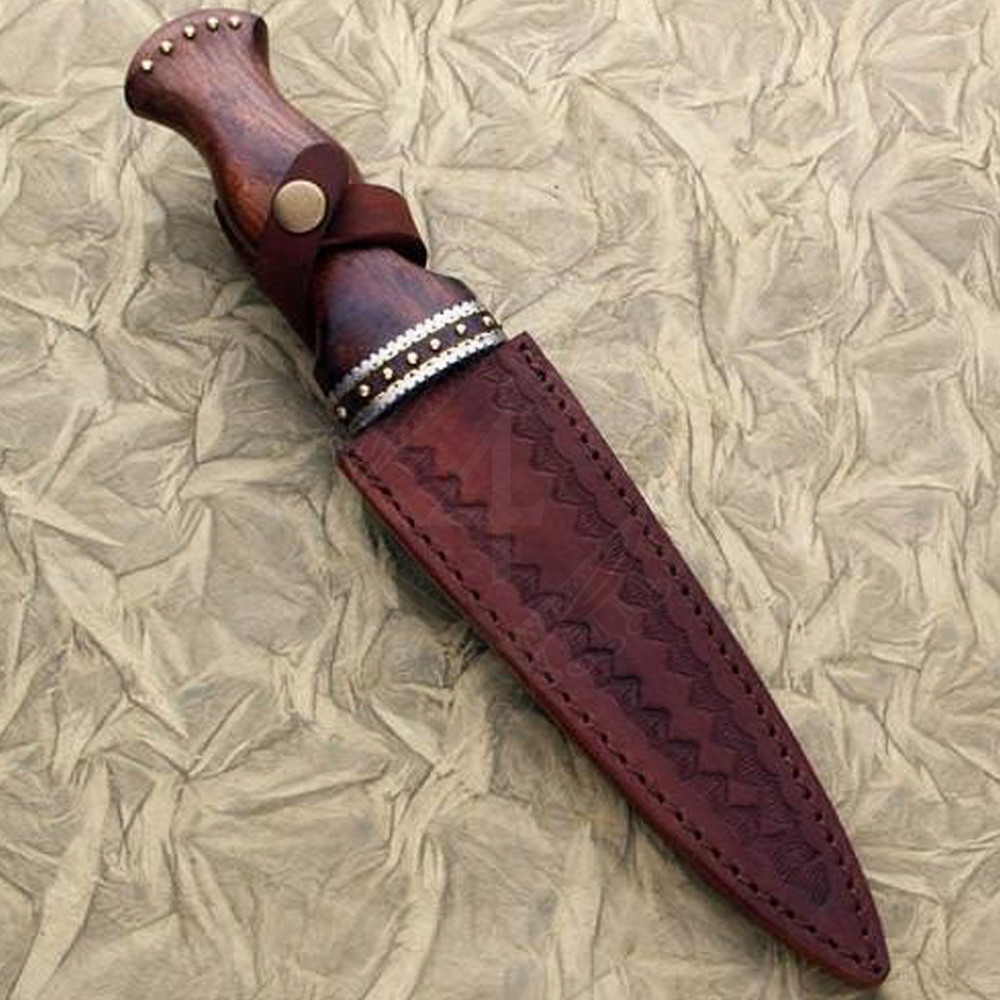 Zum Dolch wird eine maßgefertigte Scheide aus hochwertigem braunem Leder geliefert. Die Scheide ist am Rand fest vernäht, mit einem Prägemuster verziert und mit einer Halteschlaufe mit Druckknopf zur sicheren Befestigung des Dolches ausgestattet. Eine Gürtelschlaufe ist selbstverständlich vorhanden.