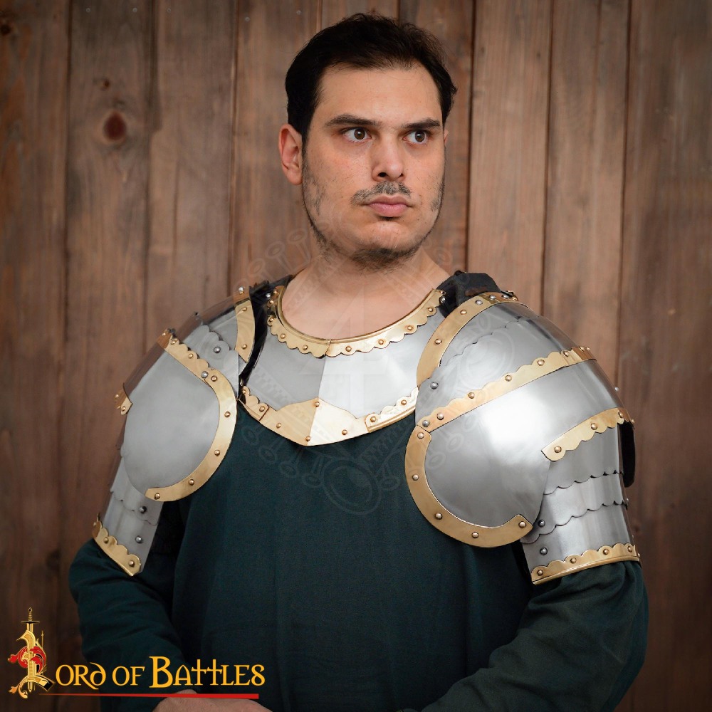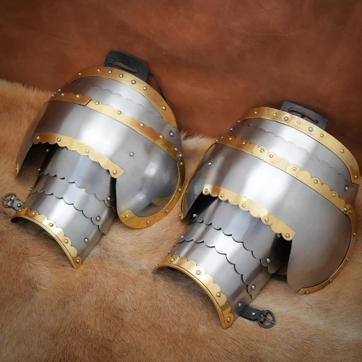 Vervollständige deine Plattenrüstung mit einem optisch eindrucksvollen und funktionalen Element, das dich direkt in die Ära des Hochmittelalters versetzt. Diese handgeschmiedeten Schulterpanzer, inspiriert vom gotischen Stil des 15. Jahrhunderts, repräsentieren die perfekte Kombination aus Schutz und handwerklichem Können. Ihr Design aus poliertem Stahl und dekorativen Messingrändern wertet dein Ritterkostüm sofort auf, egal ob du dich auf ein LARP, ein historisches Fest oder eine Theaterbühne vorbereitest. Weitere Produktinformationen ...