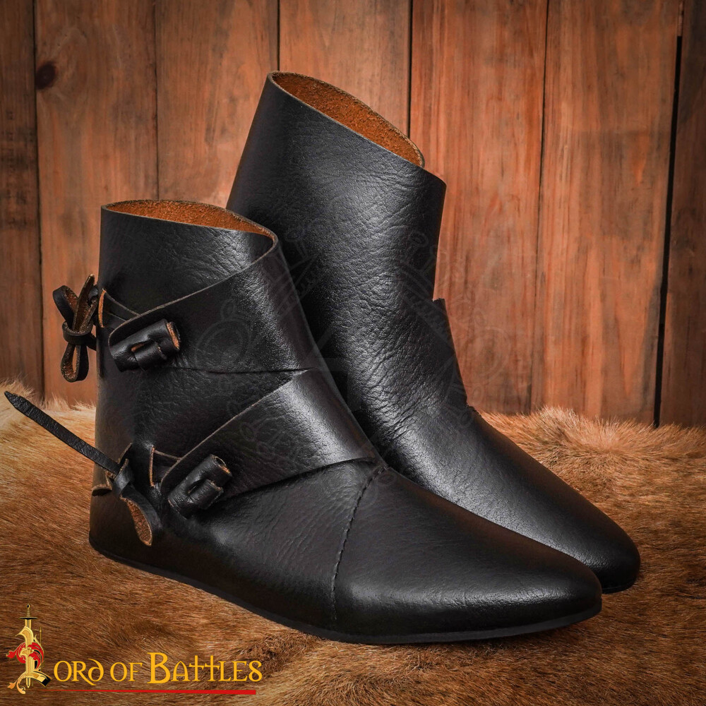 Mache eine Zeitreise mit diesen authentischen frühmittelalterlichen Schuhen, deren Design von archäologischen Funden aus der Wikingersiedlung Jorvik, dem heutigen York in England, inspiriert ist. Diese handgenähten Stiefeletten aus echtem Leder sind eine präzise Nachbildung des Schuhwerks, das von nordischen Kriegern, Siedlern und Angelsachsen im 9. und 10. Jahrhundert getragen wurde. Dank der historisch getreuen Verarbeitung und des charakteristischen Knebelverschlusses sind sie die ideale Ergänzung für dein Kostüm bei Reenactment-Veranstaltungen, LARP oder auf historischen Märkten. Weitere Produktinformationen ...