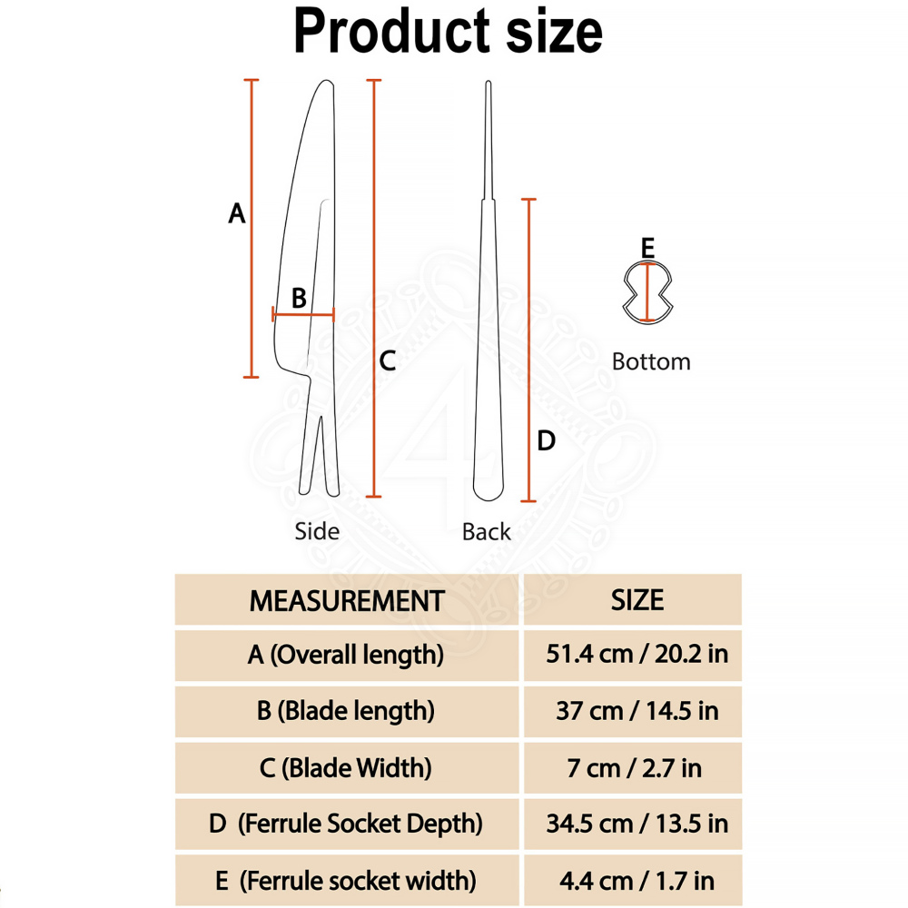 Diese Speerspitze wird einzeln geliefert, was dir die Möglichkeit gibt, einen Speer genau nach deinen Vorstellungen zusammenzustellen. Um ihn zu vervollständigen, benötigst du einen hochwertigen Holzschaft (wir empfehlen Eschenholz mit einem Durchmesser von ca. 3-4 cm). Das Ende des Schafts muss so geformt werden, dass es genau in die konische Tülle der Speerspitze passt. Für eine sichere und feste Befestigung ist es unerlässlich, die Spitze mit einem Niet oder einem Querstift zu sichern (nicht im Lieferumfang enthalten), wofür du ein Loch durch die Tülle und das Holz bohren musst.