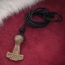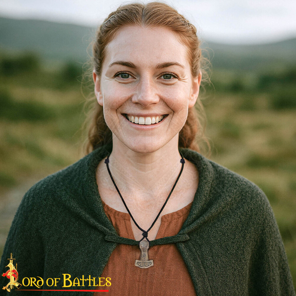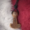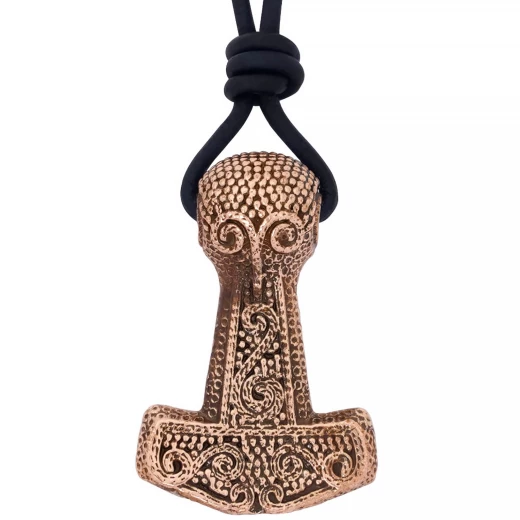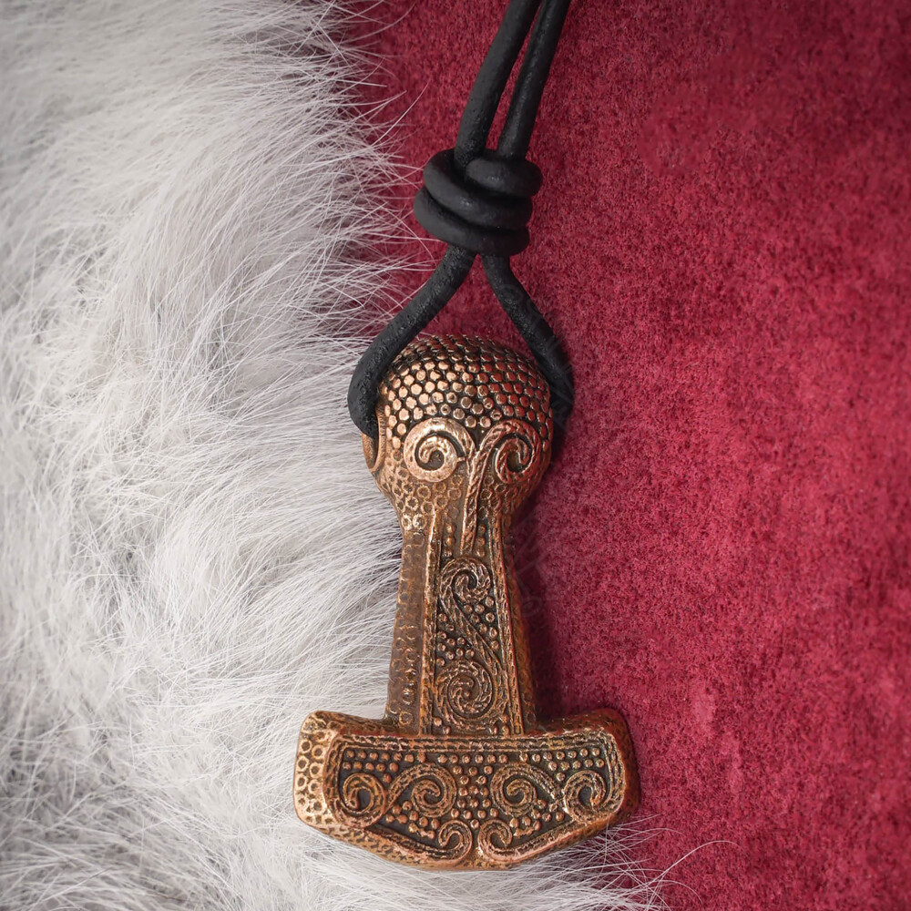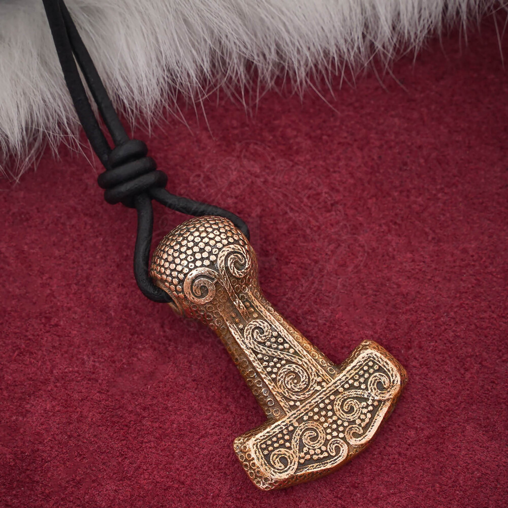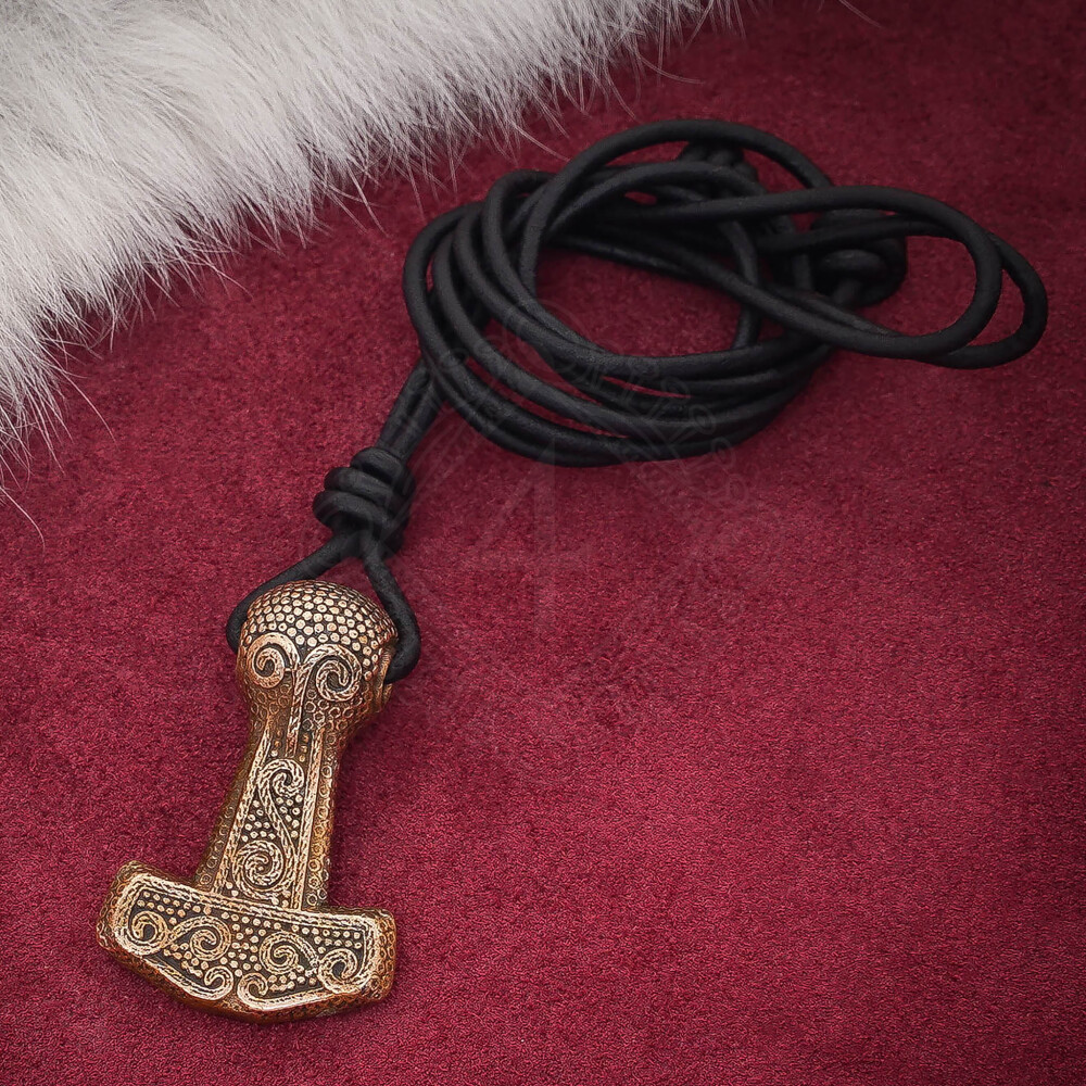 Dieses Amulett kopiert originalgetreu die Form und die Verzierungen des Artefakts aus dem 10. Jahrhundert. Die gesamte Oberfläche des Hammers ist mit einem dichten Netz aus kunstvoll verschlungenen nordischen Knoten und einer feinen granulierten Textur überzogen, die einen außerordentlich schmuckvollen Eindruck erweckt. Alle Details sind als Hochrelief ausgeführt, was dem Schmuck Tiefe und ein authentisches Aussehen verleiht. Der Anhänger ist aus massiver Bronze gegossen und hat eine antike Patina, die seinen historischen Charakter unterstreicht. Er hängt an einer hochwertigen Lederkordel mit Schiebeknoten zur einfachen Längenanpassung.
