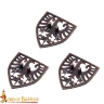 Dieses Set enthält drei identische Beschläge für Leder oder Textil in Form eines gotischen Schildes. Das zentrale Motiv ist ein stilisierter heraldischer Adler mit ausgebreiteten Flügeln, der mit viel Liebe zum historischen Detail gestaltet ist. Das durchbrochene (ajouré) Design reduziert nicht nur das Gewicht, sondern verleiht dem Beschlag auch ein elegantes und raffiniertes Aussehen. Jedes Stück ist aus massiver Bronze gefertigt, was eine lange Lebensdauer und Haltbarkeit garantiert. Auf der Rückseite befinden sich zwei robuste Stifte zur einfachen und sicheren Befestigung.