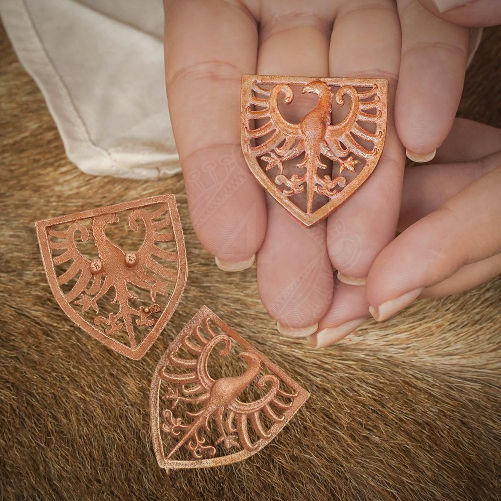 Verleihe deinem Gewand oder deinen Accessoires einen Hauch von authentischem mittelalterlichem Adel mit diesem exklusiven Set aus drei Bronzebeschlägen. Jedes Stück wird sorgfältig im Wachsausschmelzverfahren gegossen und stellt einen heraldischen Adler in einem gotischen Schild dar – ein Symbol für Stärke, Macht und Erhabenheit. Dieses detailreiche Abzeichen, inspiriert von Originalen aus dem 13. Jahrhundert, ist ideal zur Verzierung von Gürteln, Taschen, Gewändern oder sogar Rüstungsteilen. Ob du ein erfahrener Reenactor, ein begeisterter LARP-Spieler oder einfach ein Geschichtsliebhaber bist, dieser Bronzebeschlag ermöglicht es dir, dein historisches Erscheinungsbild zu perfektionieren. Das Dreier-Set bietet vielfältige Einsatzmöglichkeiten, sei es für eine symmetrische Dekoration oder zur Abstimmung mehrerer verschiedener Ausrüstungsteile. Weitere Produktinformationen ...