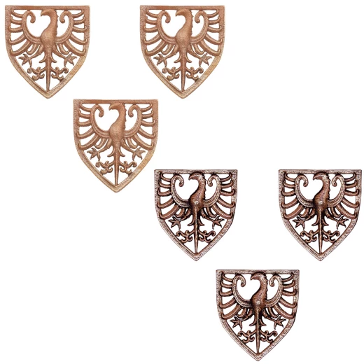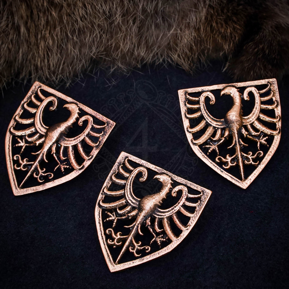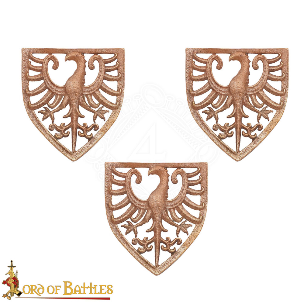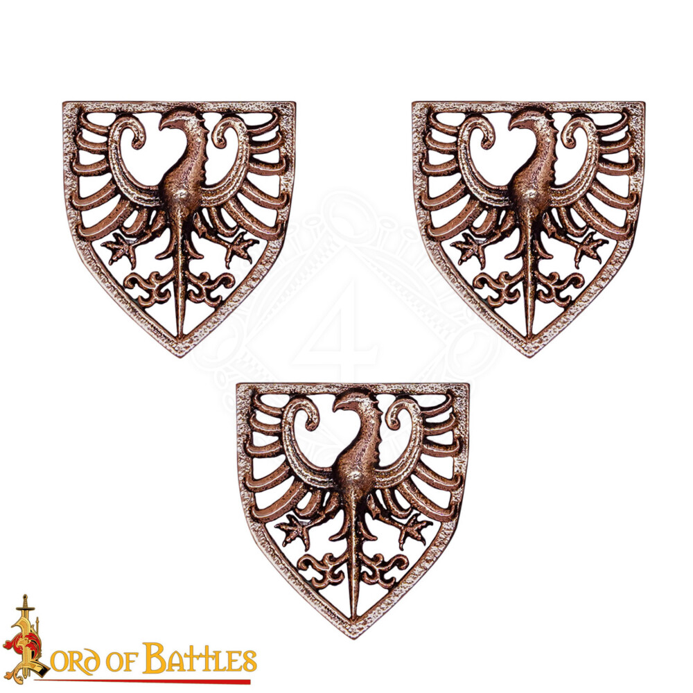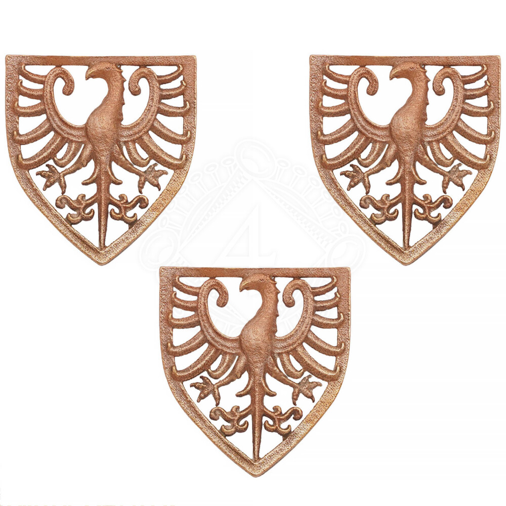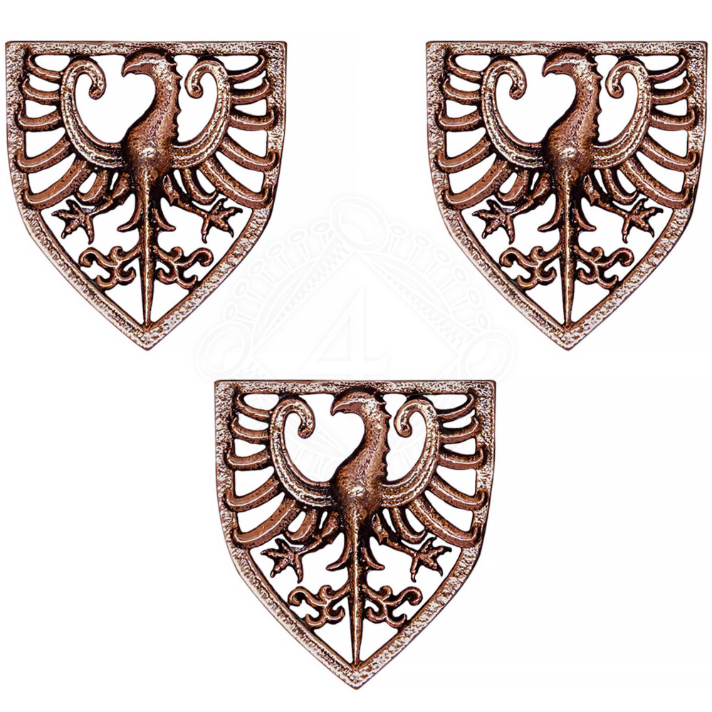 Bronzebeschlag in Schildform mit heraldischem Adler, 13. Jh., 3er-Set