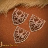 Dieses Set enthält drei identische Beschläge für Leder oder Textil in Form eines gotischen Schildes. Das zentrale Motiv ist ein stilisierter heraldischer Adler mit ausgebreiteten Flügeln, der mit viel Liebe zum historischen Detail gestaltet ist. Das durchbrochene (ajouré) Design reduziert nicht nur das Gewicht, sondern verleiht dem Beschlag auch ein elegantes und raffiniertes Aussehen. Jedes Stück ist aus massiver Bronze gefertigt, was eine lange Lebensdauer und Haltbarkeit garantiert. Auf der Rückseite befinden sich zwei robuste Stifte zur einfachen und sicheren Befestigung.