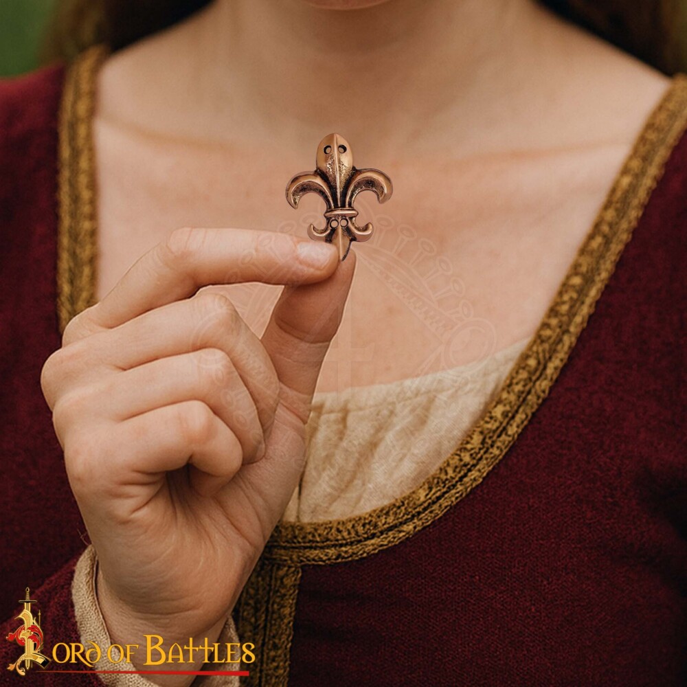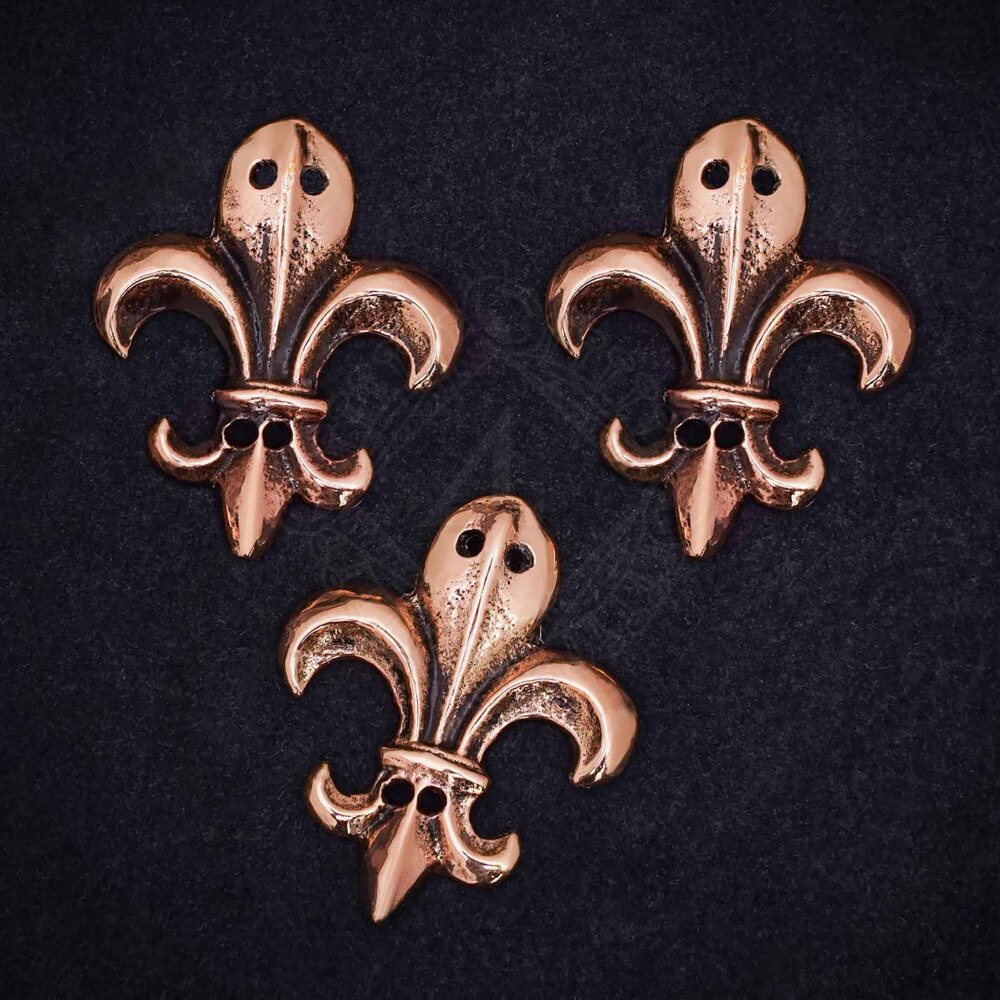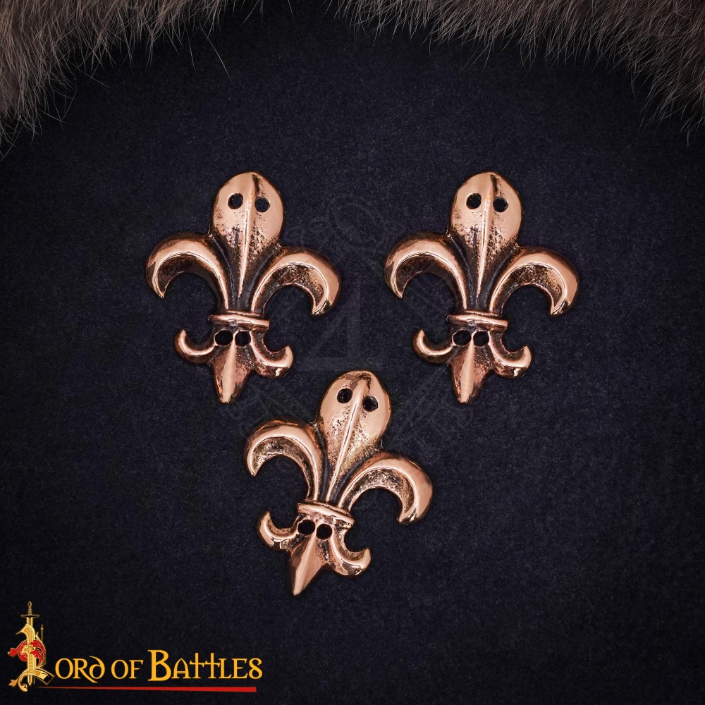 Verleihe deinem historischen Kostüm, Gürtel oder deiner Tasche einen Hauch königlicher Eleganz mit diesem Set aus drei Bronze-Beschlägen in Form der Fleur-de-Lis. Dieses ikonische Symbol, untrennbar mit der französischen Monarchie, dem Adel und dem Rittertum verbunden, war eines der am weitesten verbreiteten heraldischen Zeichen im mittelalterlichen Europa. Unser Set aus drei Stück, gegossen aus massiver Bronze, ermöglicht es dir, ein einheitliches und stilvolles Design für deine Ausrüstung zu schaffen. Jeder Beschlag wird im traditionellen Wachsausschmelzverfahren hergestellt, was scharfe Details und ein authentisches Aussehen garantiert. Dank der vier vorgebohrten Löcher ist die Anbringung ein Kinderspiel. Ob du dich dem Reenactment, LARP oder historischen Handwerken widmest, diese heraldische Lilie wird zu einer großartigen Ergänzung deiner Ausrüstung. Weitere Produktinformationen ...