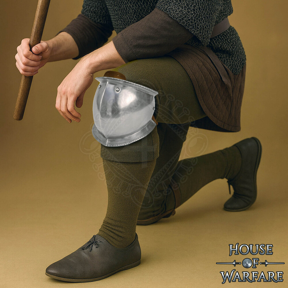 Diese Platten-Kniekacheln sind so konzipiert, dass sie die Form des Knies optimal nachbilden und gleichzeitig deine Bewegungsfreiheit so wenig wie möglich einschränken. Du kannst sie separat über gepolsterten Beinlingen (Gambeson-Beinen) oder Kettenbeinlingen tragen oder sie als Teil eines kompletten Beinzeugs integrieren. Dank des einfachen, aber bewährten Systems aus Lederriemen ist das Anlegen eine Sache von Augenblicken und stellt sicher, dass sie auch im Eifer des Gefechts an ihrem Platz bleiben.