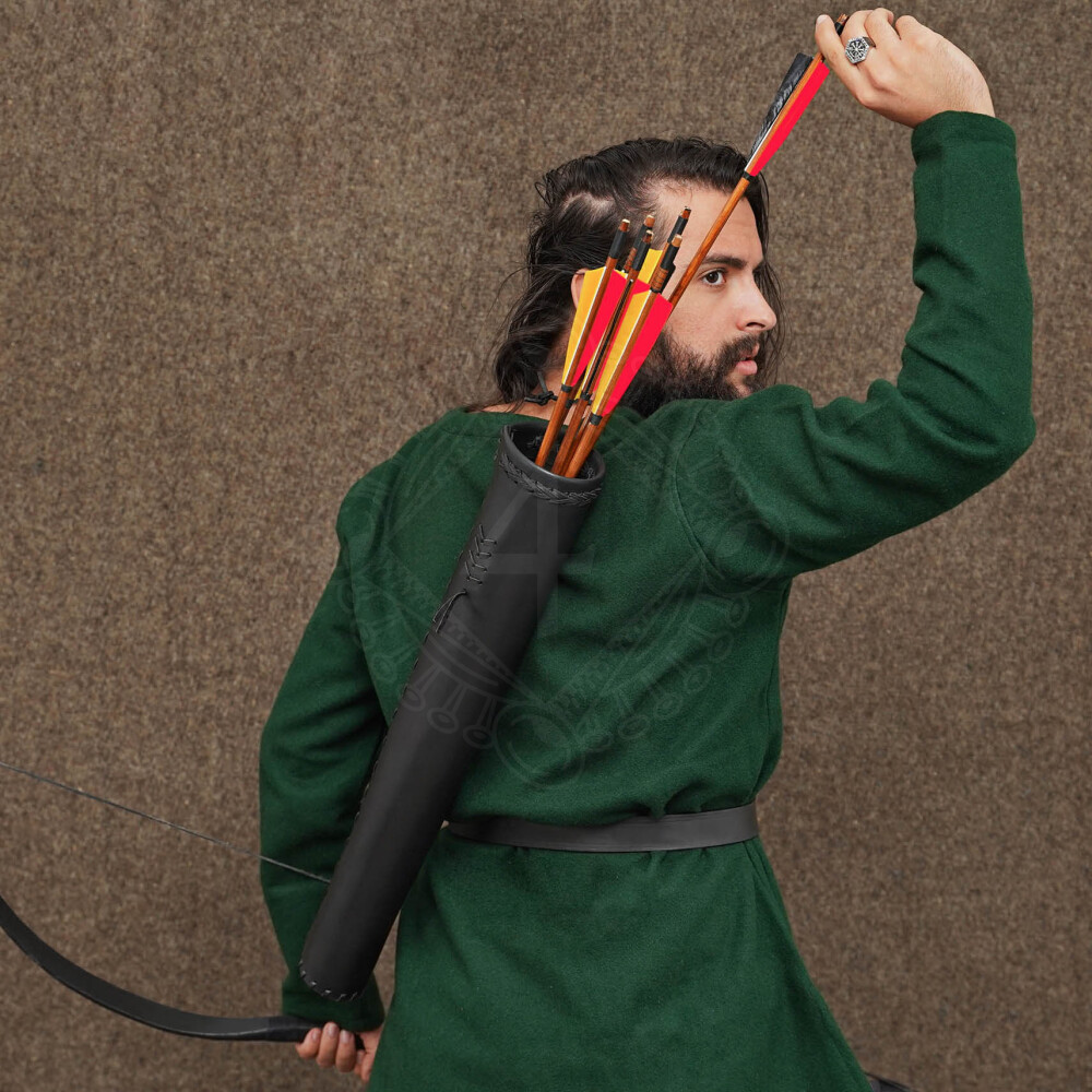 Obwohl wir uns Bogenschützen heute meistens mit einem Köcher auf dem Rücken vorstellen, wie wir es aus den Geschichten von Robin Hood kennen, war in der Geschichte, insbesondere in militärischen Formationen, das Tragen des Köchers an der Hüfte weit verbreitet. Diese Methode ermöglichte einen noch schnelleren Zugriff auf die Pfeile und weniger Bewegungseinschränkung im Schlachtgetümmel. Dank des verstellbaren Riemens kannst du beide Tragevarianten ausprobieren!