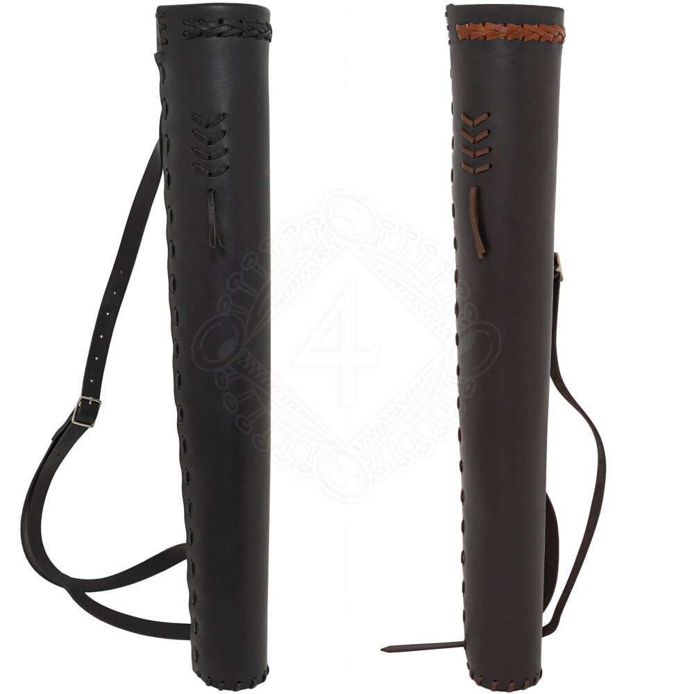 Dieser Köcher hat eine klassische zylindrische Form und ist aus festem, widerstandsfähigem Echtleder gefertigt. Du kannst zwischen zwei Farbvarianten wählen – zeitlosem Schwarz und elegantem Dunkelbraun.