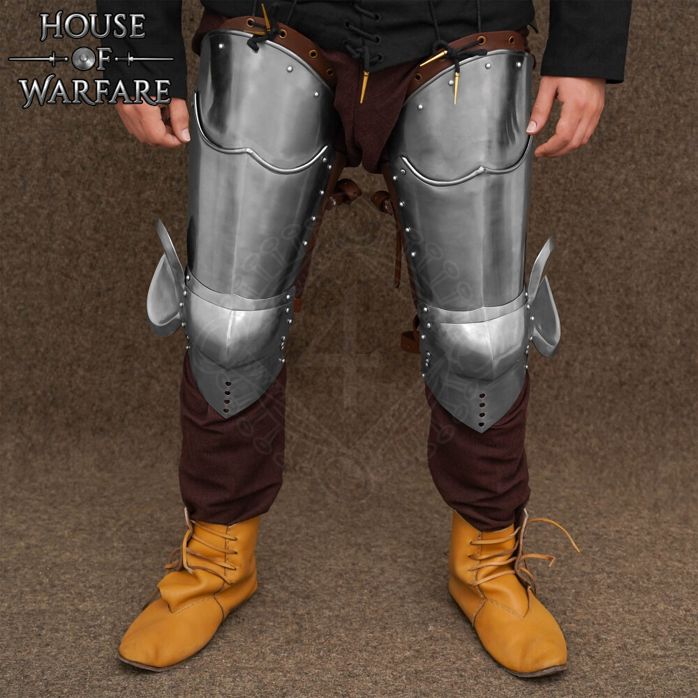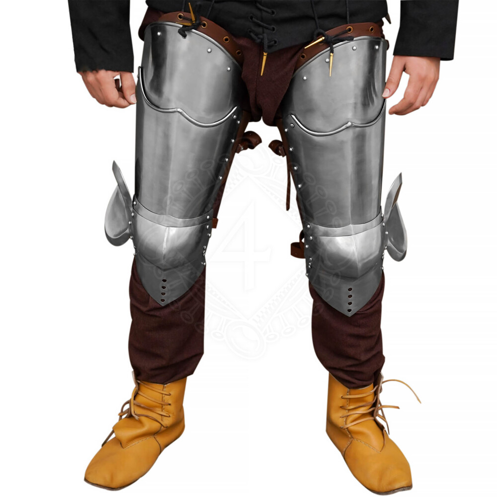 - Beinschienen (Greave): Decken das Schienbein von vorne und teilweise von den Seiten ab. Ihre Form ist nach unten verlängert, um auch einen Teil des Spanns zu schützen. Das gesamte Set wird mit robusten Lederriemen und Stahlschnallen befestigt.
