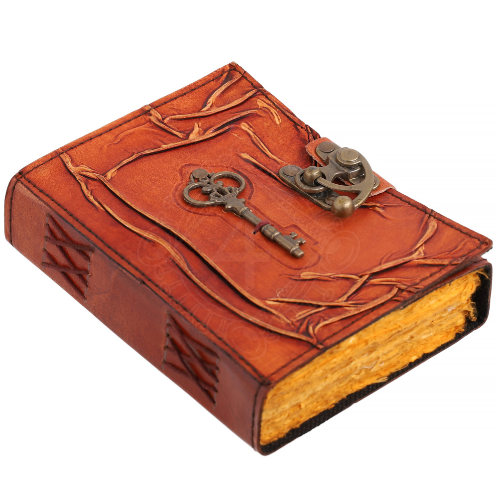 Ist dies der Schlüssel zu deinen Erinnerungen, geheimem Wissen oder längst vergessenen Zaubersprüchen? Dieses wunderschöne Lederbuch ist wie geschaffen, um deine wichtigsten Gedanken festzuhalten. Sein Einband aus Echtleder in einem warmen Cognac-Farbton wird von einem zentralen Motiv dominiert – einem Metallschlüssel in Antik-Finish. Der Schlüssel ist in einen geprägten Rahmen aus Knautschleder eingebettet, der an die Wurzeln oder Äste eines uralten Baumes erinnert. Im Inneren warten 200 Seiten (100 Blatt) handgeschöpftes Pergamentpapier mit gerissenen Kanten auf dich, die ihm den perfekten antiken Look verleihen. All deine Geheimnisse werden durch eine stilvolle Metall-Hakenschließe sicher verwahrt. Ideal für dein Grimoire, das Tagebuch eines Abenteurers oder als Skizzenbuch. Weitere Produktinformationen ...