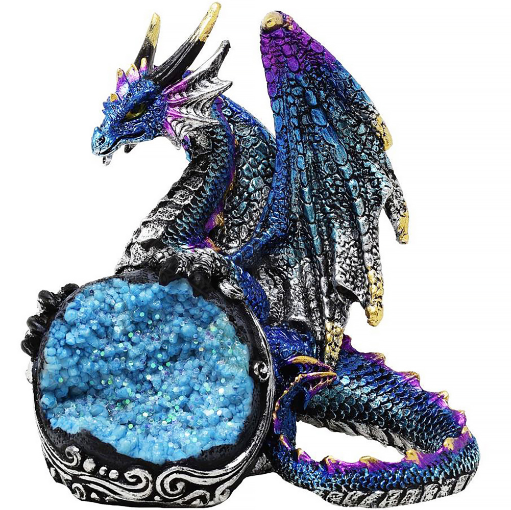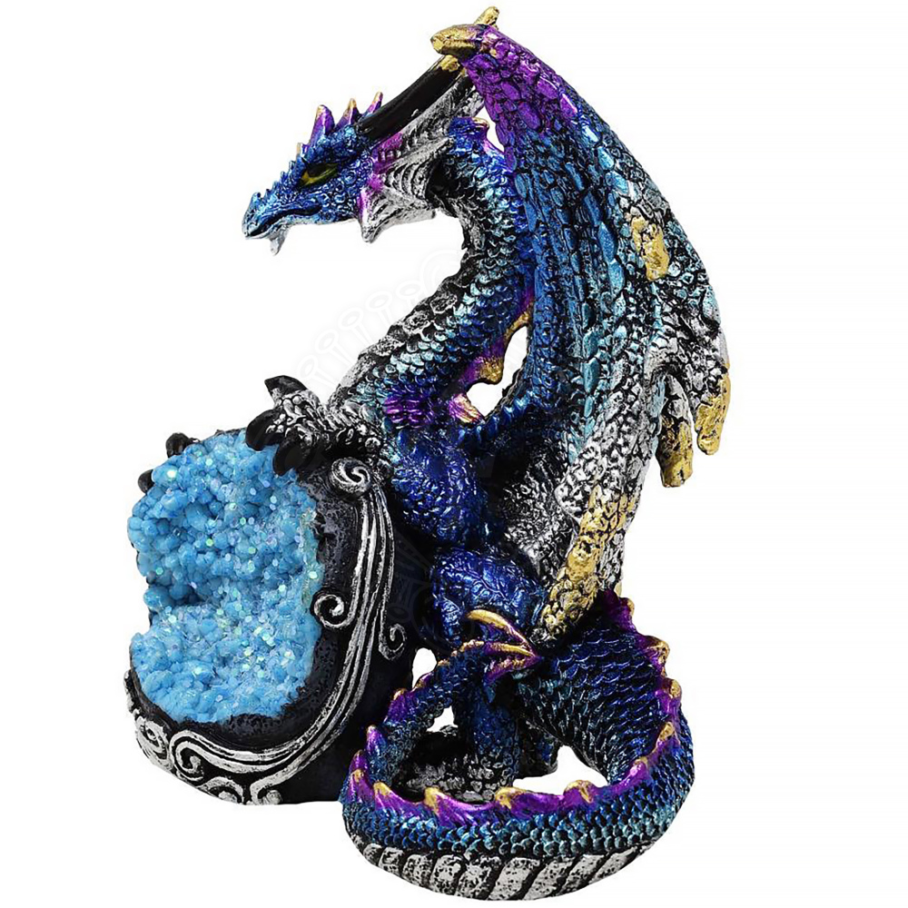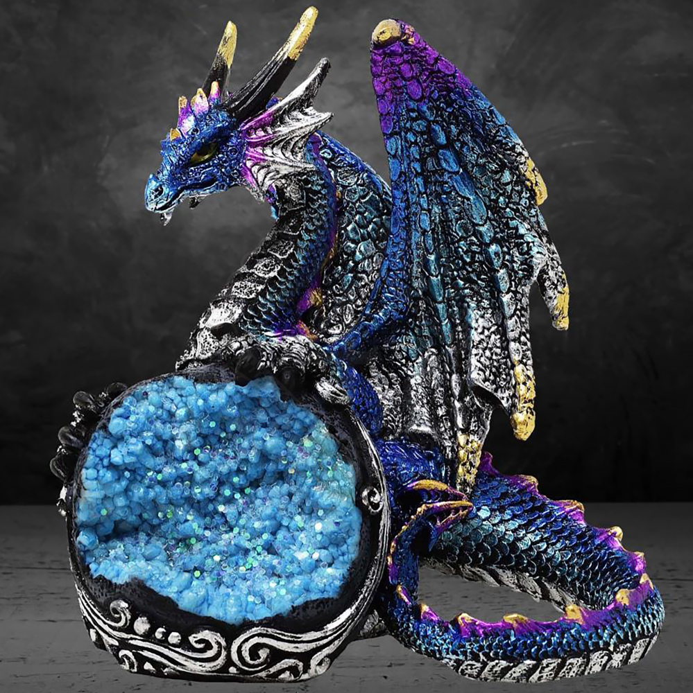 Die Geode selbst, auf der der Drache ruht, ist mit einer Imitation blauer Kristalle und feinem Glitzer gefüllt, die im Licht wunderschön funkeln und eine magische Aura erzeugen. Der Sockel ist mit reliefartigen Ornamenten verziert, die an keltische Knoten oder Windböen erinnern, hervorgehoben durch eine silberne Patina auf dunklem Grund.