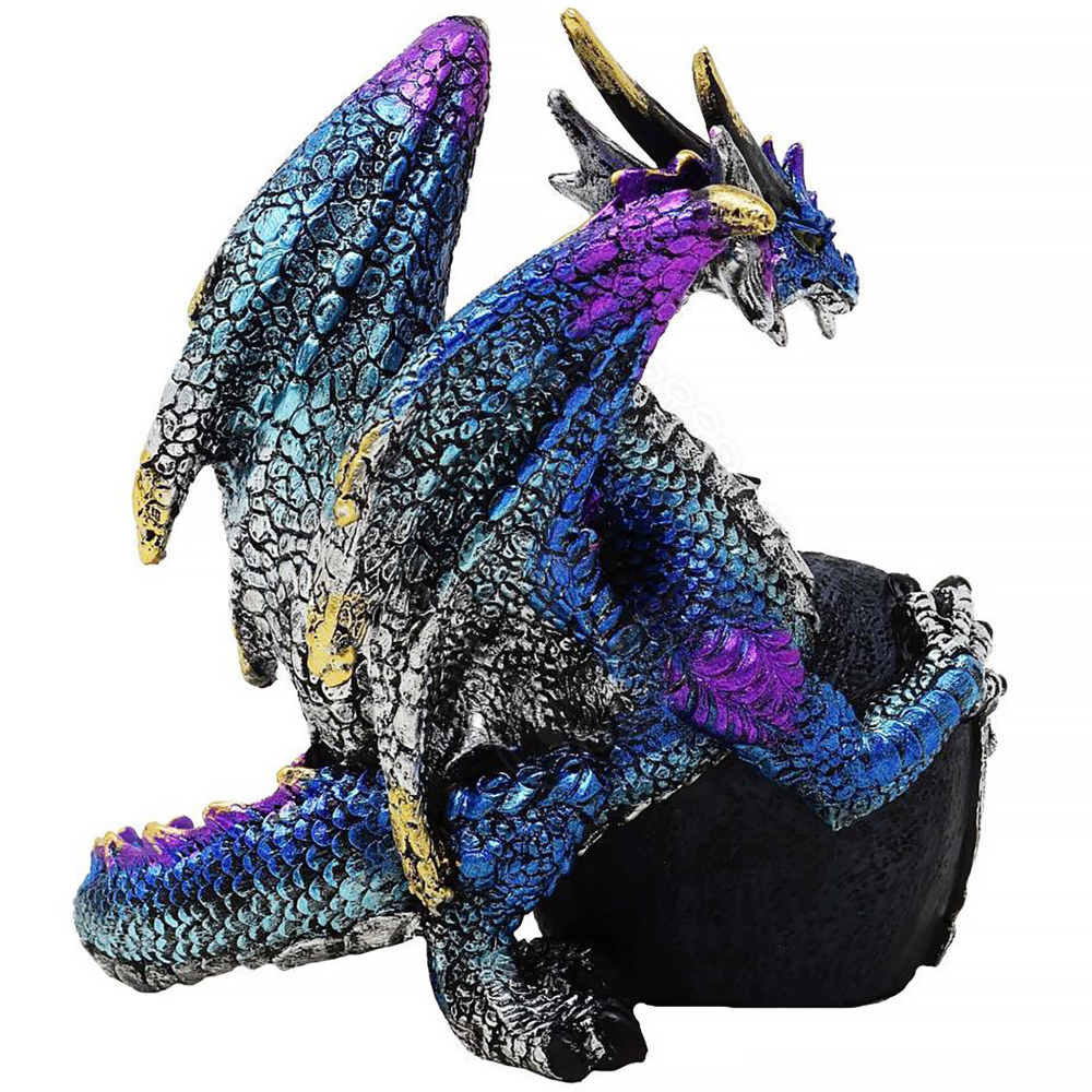 Diese Statuette zeigt einen jungen Drachen in wachsamer Pose, der mit seinen Klauen seinen kostbarsten Schatz beschützt – eine leuchtende Kristallgeode. Der Drache besticht durch atemberaubende Farbtöne in Metallic-Blau und Violett, die am Bauch und an der Unterseite des Halses sanft in Silber übergehen. Seine Hörner, Krallen und die Dornen an den Flügeln sind in Gold akzentuiert, was dem Ganzen ein königliches und erhabenes Aussehen verleiht.