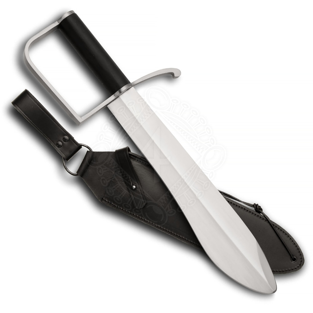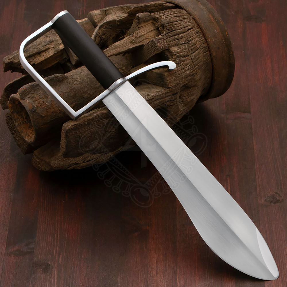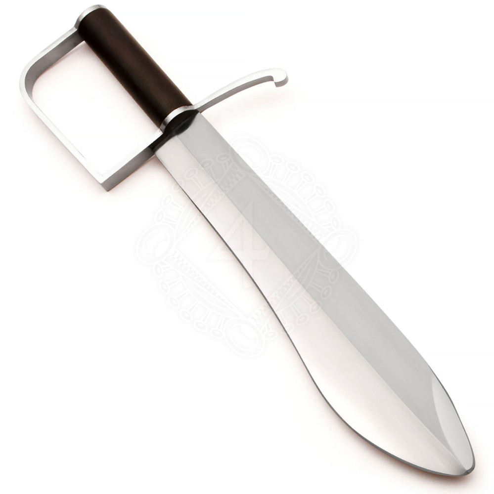 Die Basis bildet eine Klinge aus 1075 Kohlenstoffstahl. Sie besitzt eine abgerundete Spitze und einen Hohlschliff, was ihr hervorragende Schneideigenschaften verleiht. Der Griff ist typisch für die großen Messer jener Ära – ein schlichter, gedrechselter Zylinder aus dunkel gebeiztem Holz. Was jedoch sofort ins Auge fällt, ist der stählerne D-Bügel (D-Guard). Dieses Element, ursprünglich zum Schutz der Fingerknöchel im Kampf gedacht, verleiht dem Messer sein unverwechselbares, raues Aussehen.
