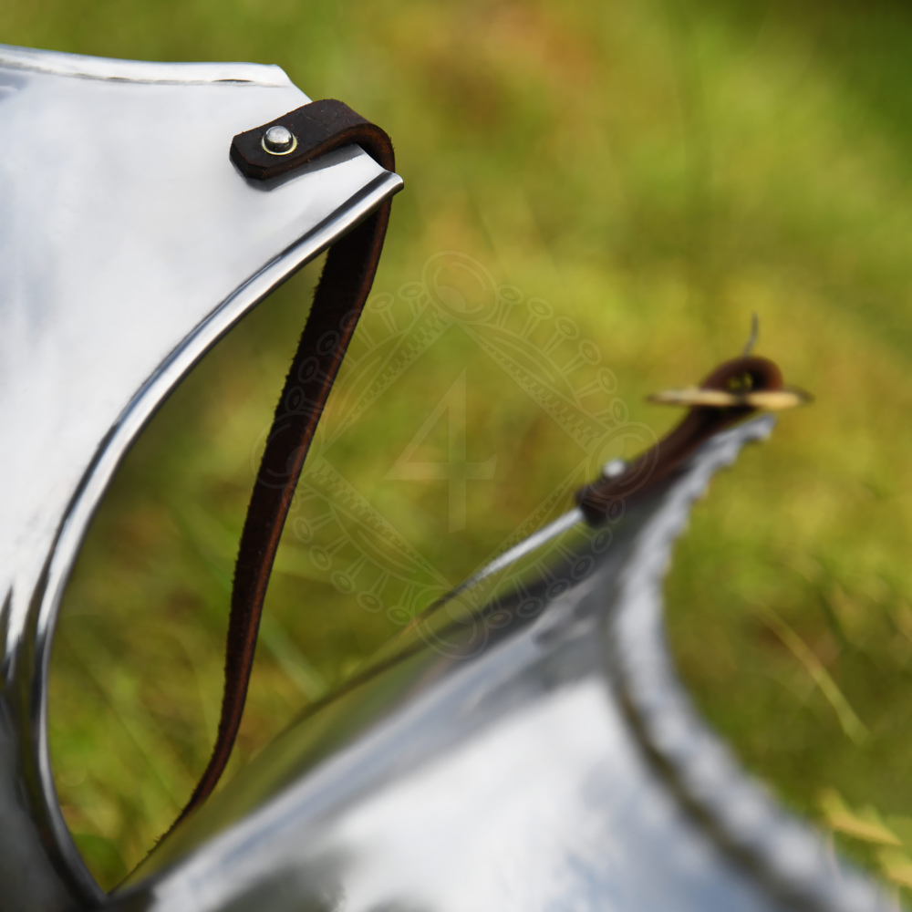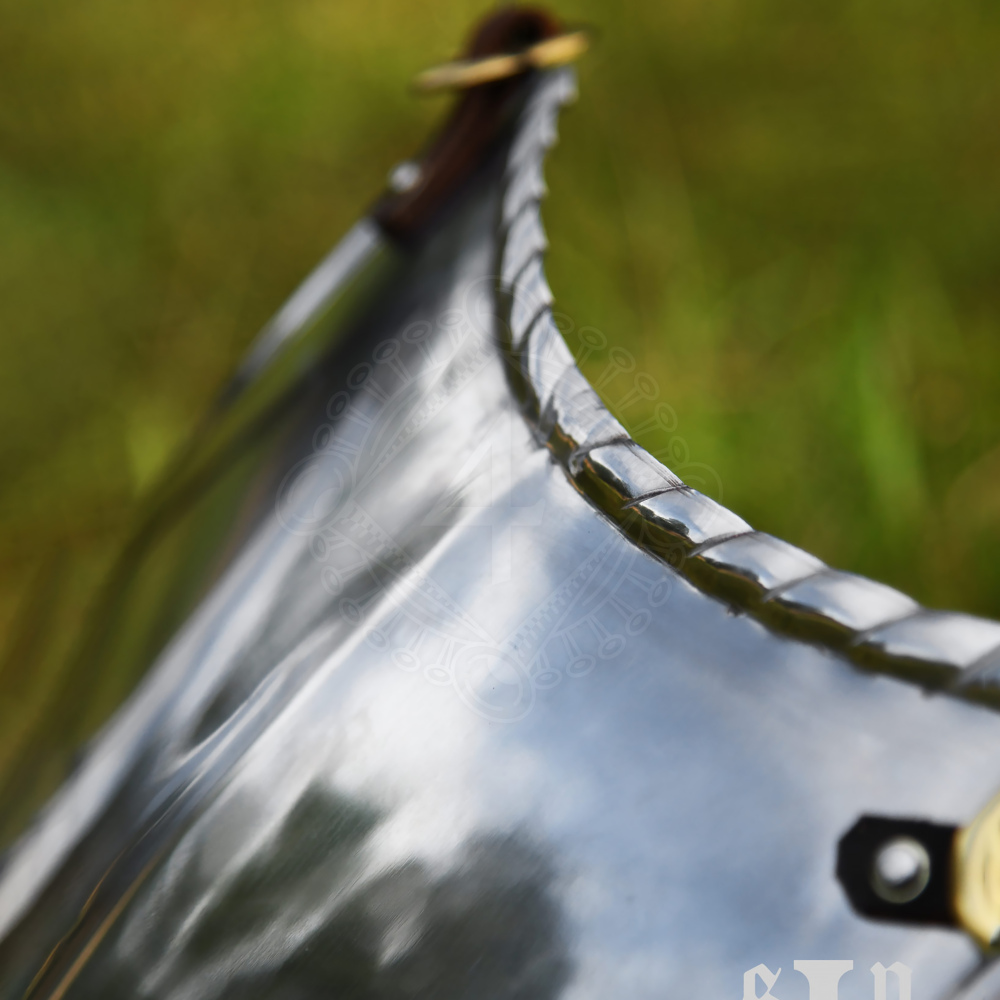 Der hier verwendete Stahl ist nicht rostfrei. Damit dein Harnisch lange hält: 1. Pflege: Behandle den Stahl regelmäßig mit einem geeigneten Öl (z.B. **Ballistol**). Das gilt besonders nach dem Tragen, da Schweiß Rost fördert. 2. Lagerung: Bewahre die Rüstung an einem trockenen Ort auf. 3. Leder: Halte die Riemen geschmeidig, indem du sie gelegentlich mit Lederfett behandelst.