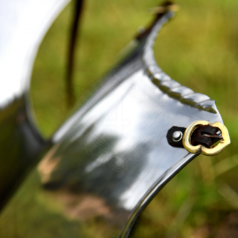 - Verbindung: Die beiden Hälften werden mit robusten Lederriemen und massiven Messingschnallen (im Antik-Look) verbunden. Diese befinden sich an den Schultern und an den Seiten, was dir eine individuelle Größenanpassung ermöglicht.