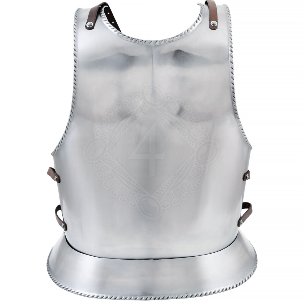 Damit der Harnisch perfekt sitzt, werden Vorder- und Rückseite mit 2 mm starken Lederriemen verbunden. Diese befinden sich an den Schultern und an den Seiten. Die Schnallen sind aus Messing gefertigt und haben ein schönes Antik-Finish. Dank dieses Systems lässt sich der Brustumfang großzügig verstellen, sodass die Rüstung auch über dickeren Gambesons bequem getragen werden kann.