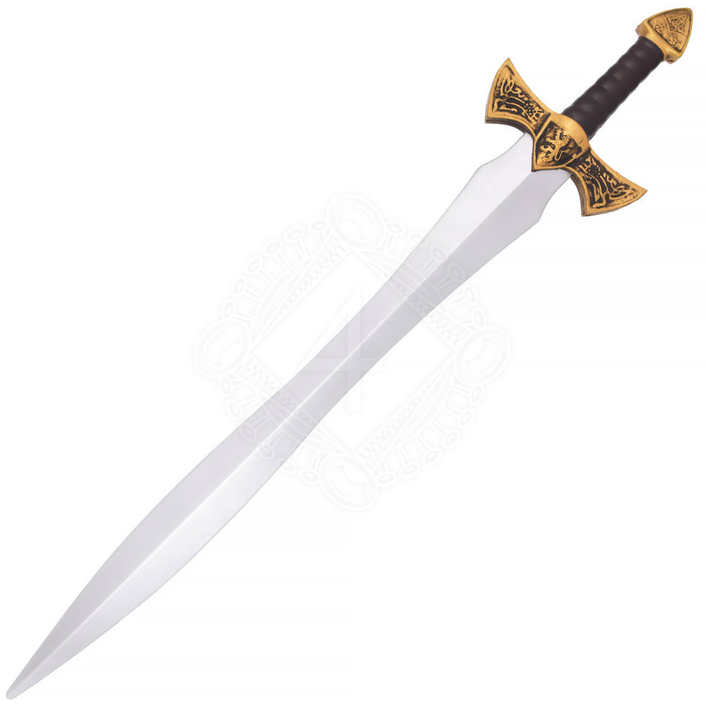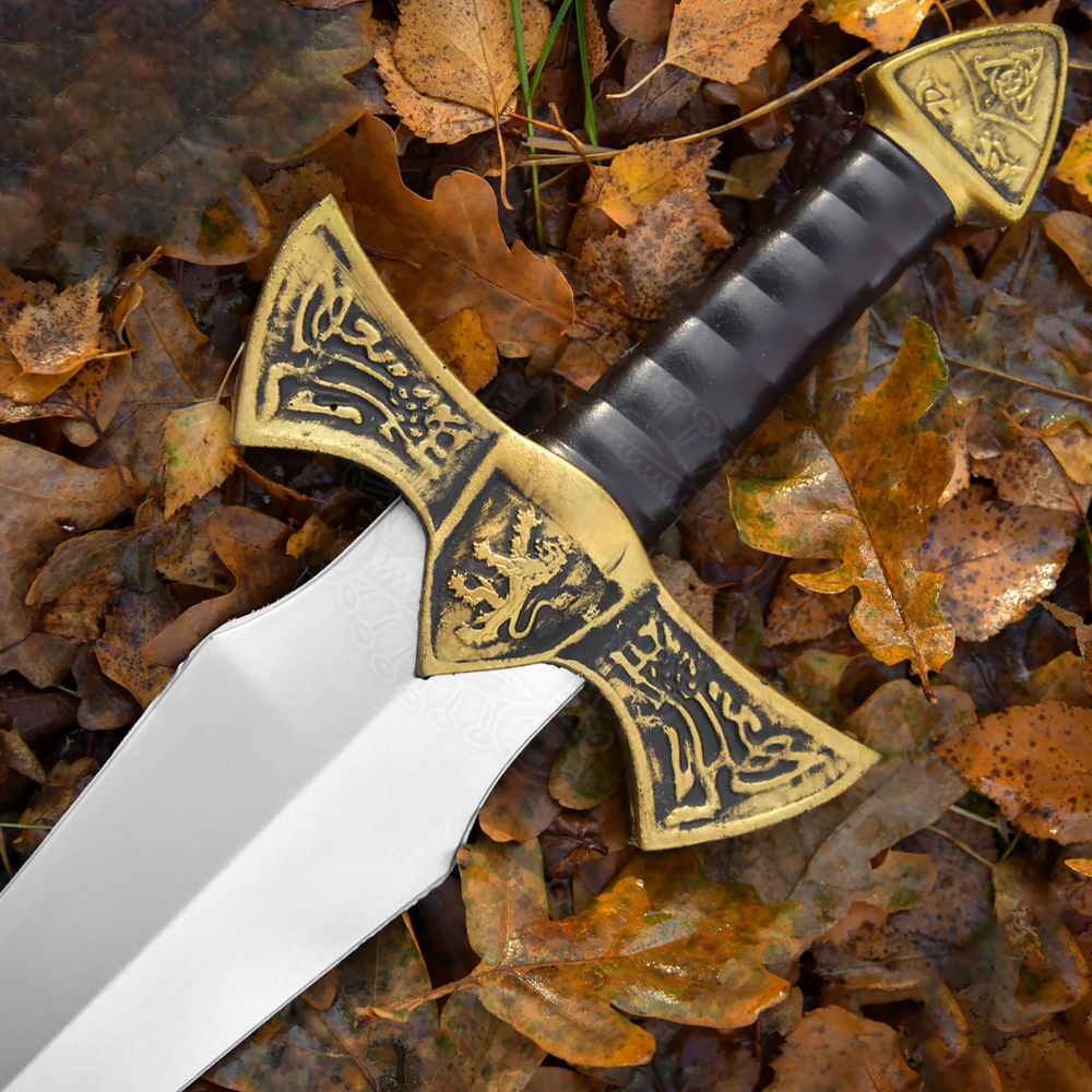 Das Schwert besteht aus hochwertigem Polyurethanschaum (PU), der um einen robusten Fiberglaskern geformt ist, was für die nötige Stabilität im Gefecht sorgt. Die silbern lackierte, zweischneidige Klinge wirkt täuschend echt. Der braune Griff in Lederoptik bietet dir auch bei hitzigen Kämpfen optimalen Halt. Besonders hervorzuheben sind der goldene Knauf und die Parierstange, die mit aufwendigen Löwen-Verzierungen versehen sind.