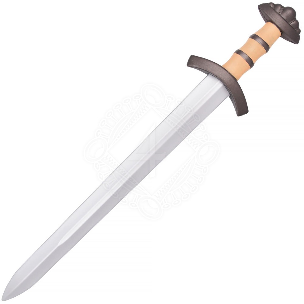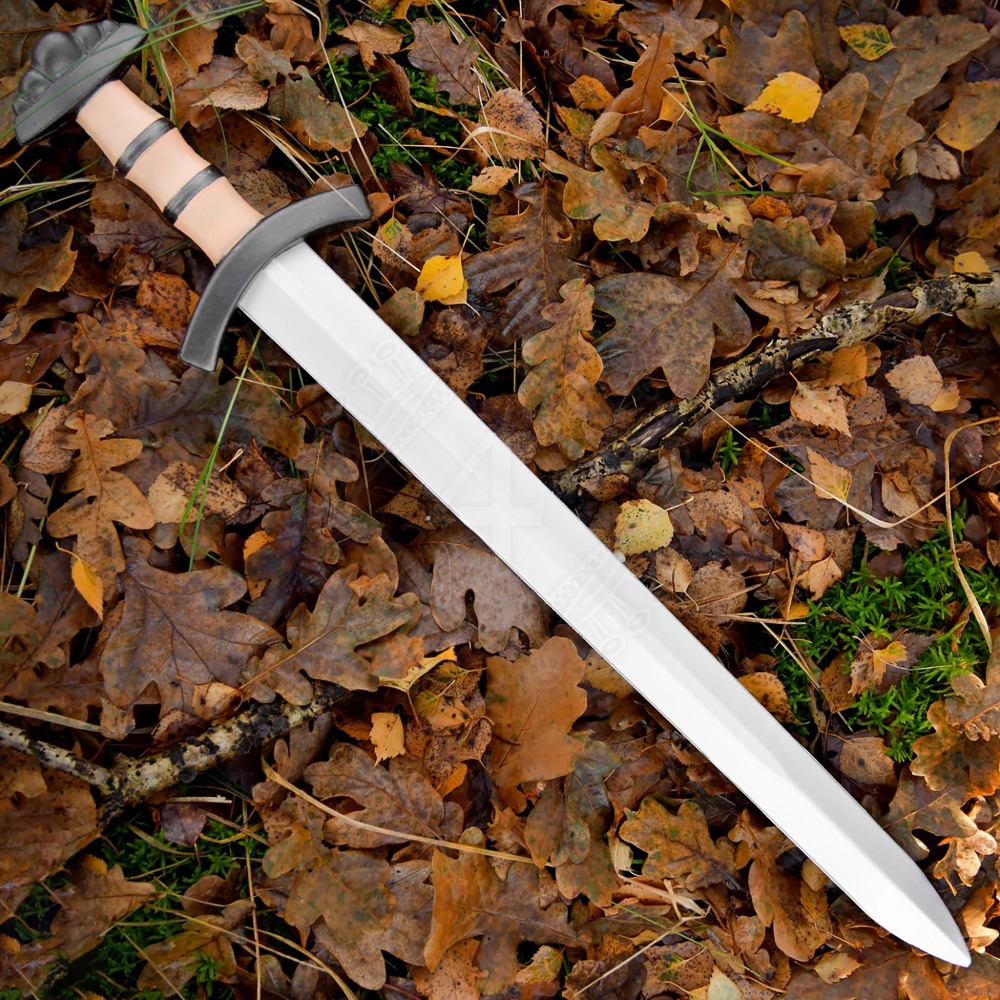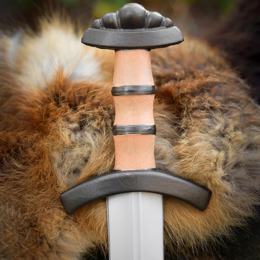 Die silberne Klinge mit ihrer mittig verlaufenden Hohlkehle wirkt täuschend echt und verleiht dem Schwert Tiefe. Der Griff ist ein optisches Highlight: Er imitiert helles Holz oder Knochen und wird von dunklen Zierringen unterbrochen, die für einen festen Halt sorgen. Abgeschlossen wird das Gefäß durch eine kurze, gebogene Parierstange und einen charakteristischen fünflappigen Knauf. Diese Knaufform war bei historischen Wikingerschwertern weit verbreitet und verleiht Leifr einen absolut authentischen Look.