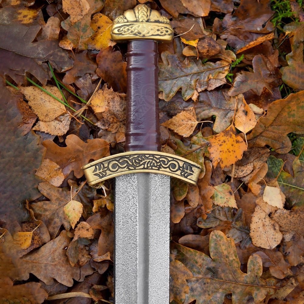 • Das Gefäß: Parierstange und Knauf sind in einem antiken Gold-Finish gehalten und mit feinen, nordischen Knotenmustern verziert. Der für Wikinger typische fünflappige Knauf sorgt für einen authentischen Abschluss.