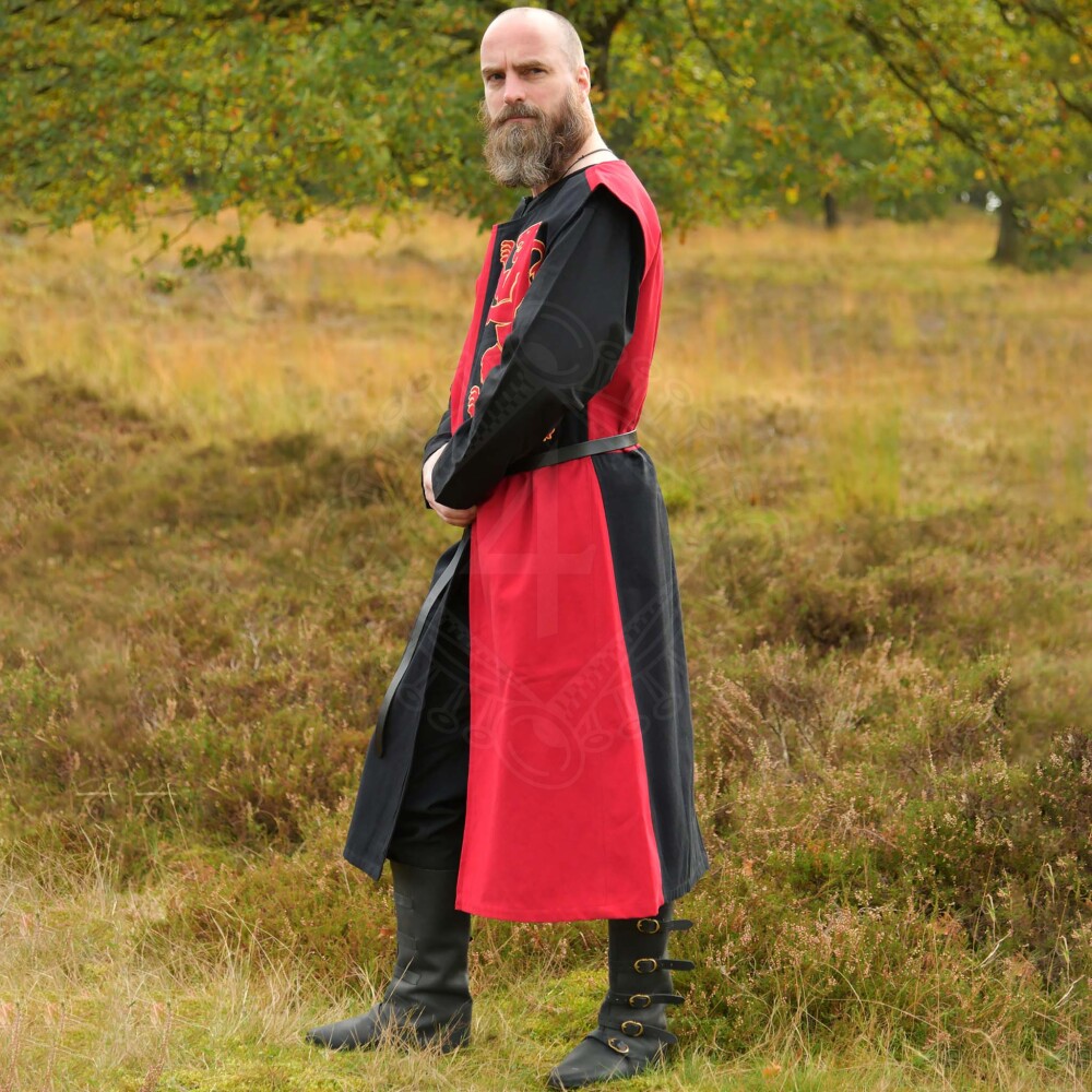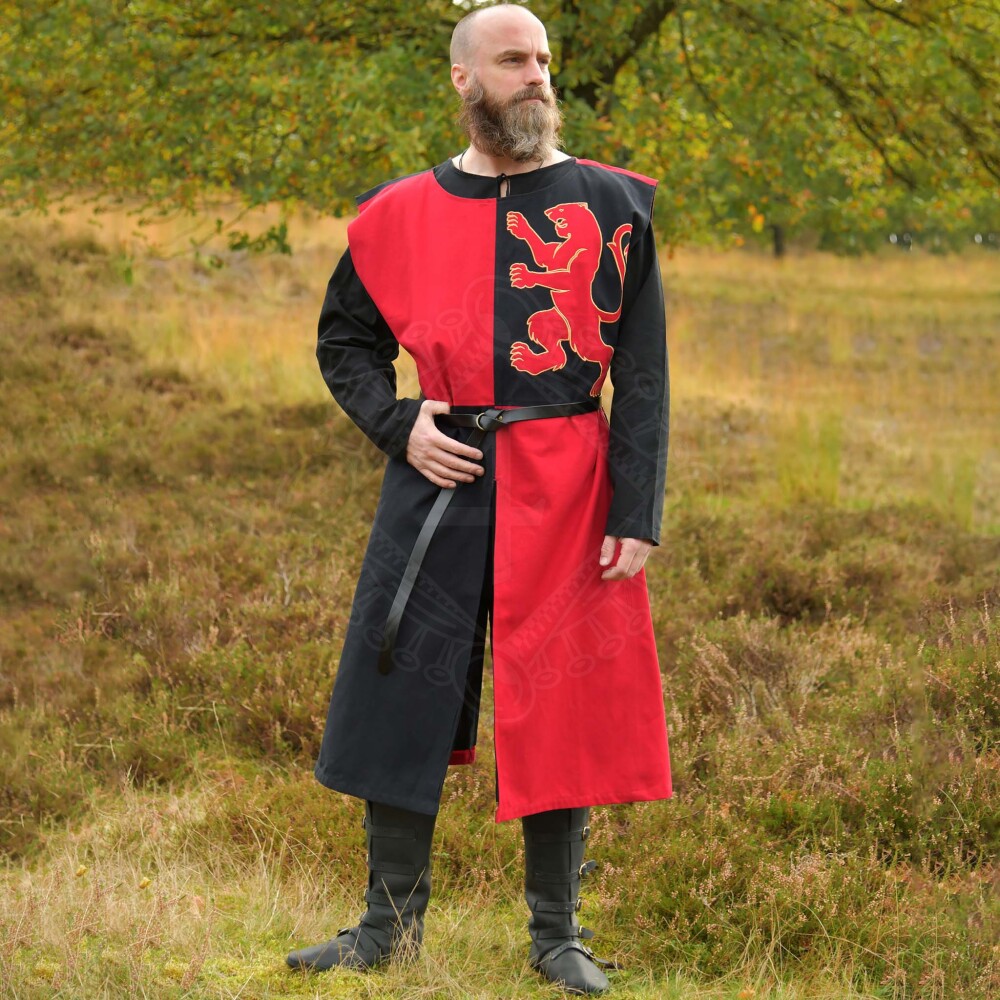 Gefütterter Wappenrock mit Löwen – Rot/Schwarz Mi-Parti