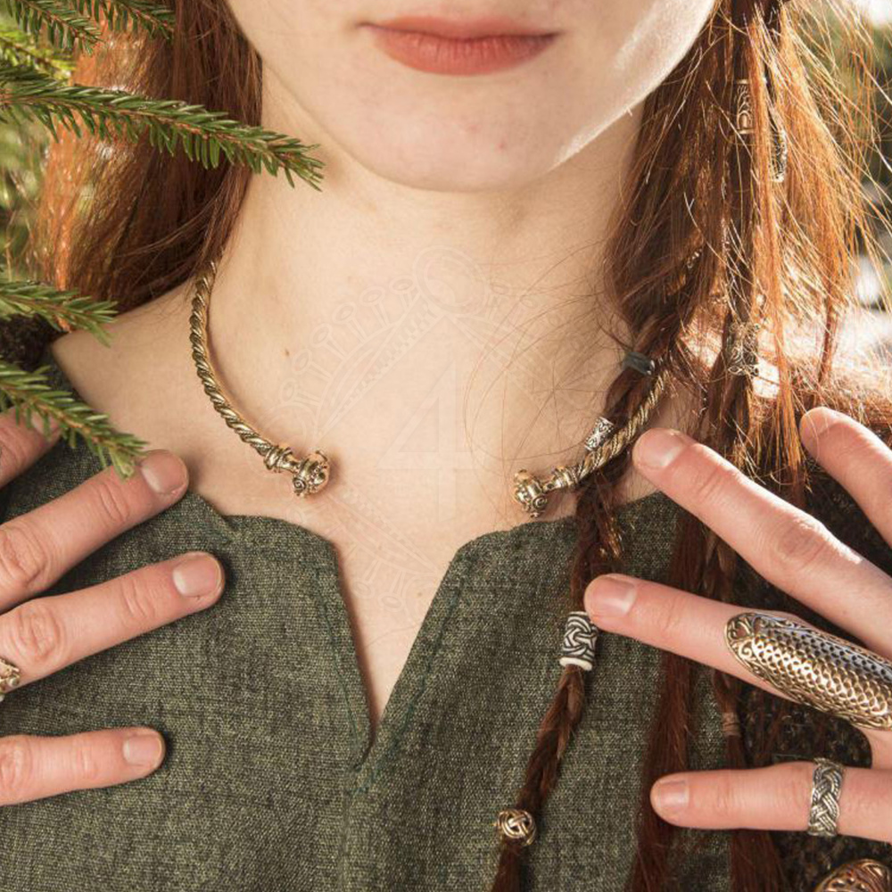 Um dein Wikinger-Set zu vervollständigen, empfehlen wir dir zu diesem Halsring auch einen Messingring mit Flechtmuster (z.B. Artikelnummer 140001) oder eine stilvolle Hufeisenfibel für deinen Mantel (z.B. Artikelnummer 140005). Der Torques wirkt am besten in Kombination mit einer Leinentunika oder einem Wollkaftan.