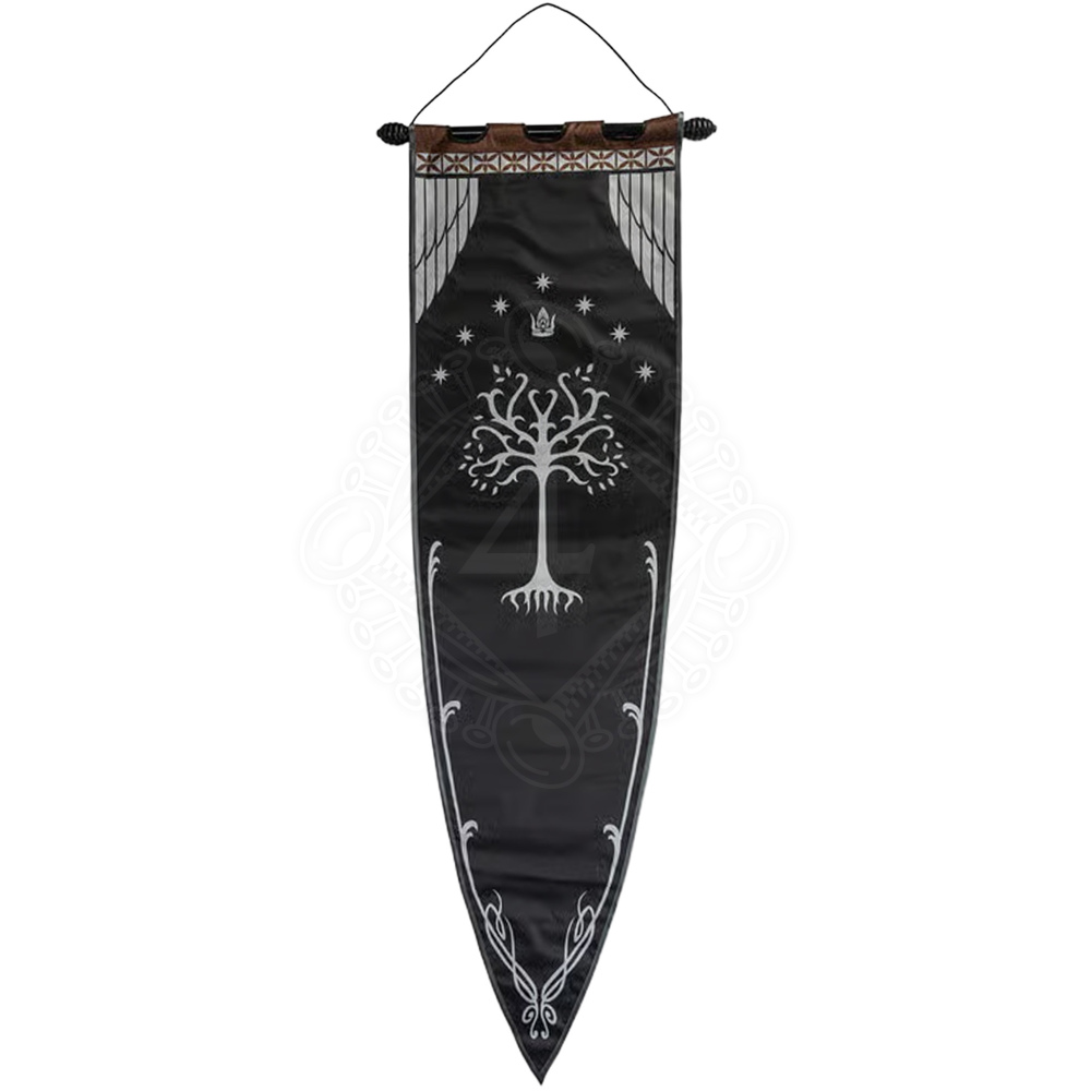 In der Geschichte von Mittelerde war dieses Banner das Zeichen des Hauses Elendil. Während der Zeit der Truchsesse blieb die Krone auf dem Banner verborgen, doch Aragorn entrollte sie erneut als Zeichen seines Anspruchs. Interessante Tatsache: Die sieben Sterne repräsentieren ursprünglich die sieben Schiffe, mit denen die Dúnedain nach dem Untergang von Númenor Mittelerde erreichten. Dieses Banner symbolisiert die Wiedervereinigung von Arnor und Gondor unter einer Krone.