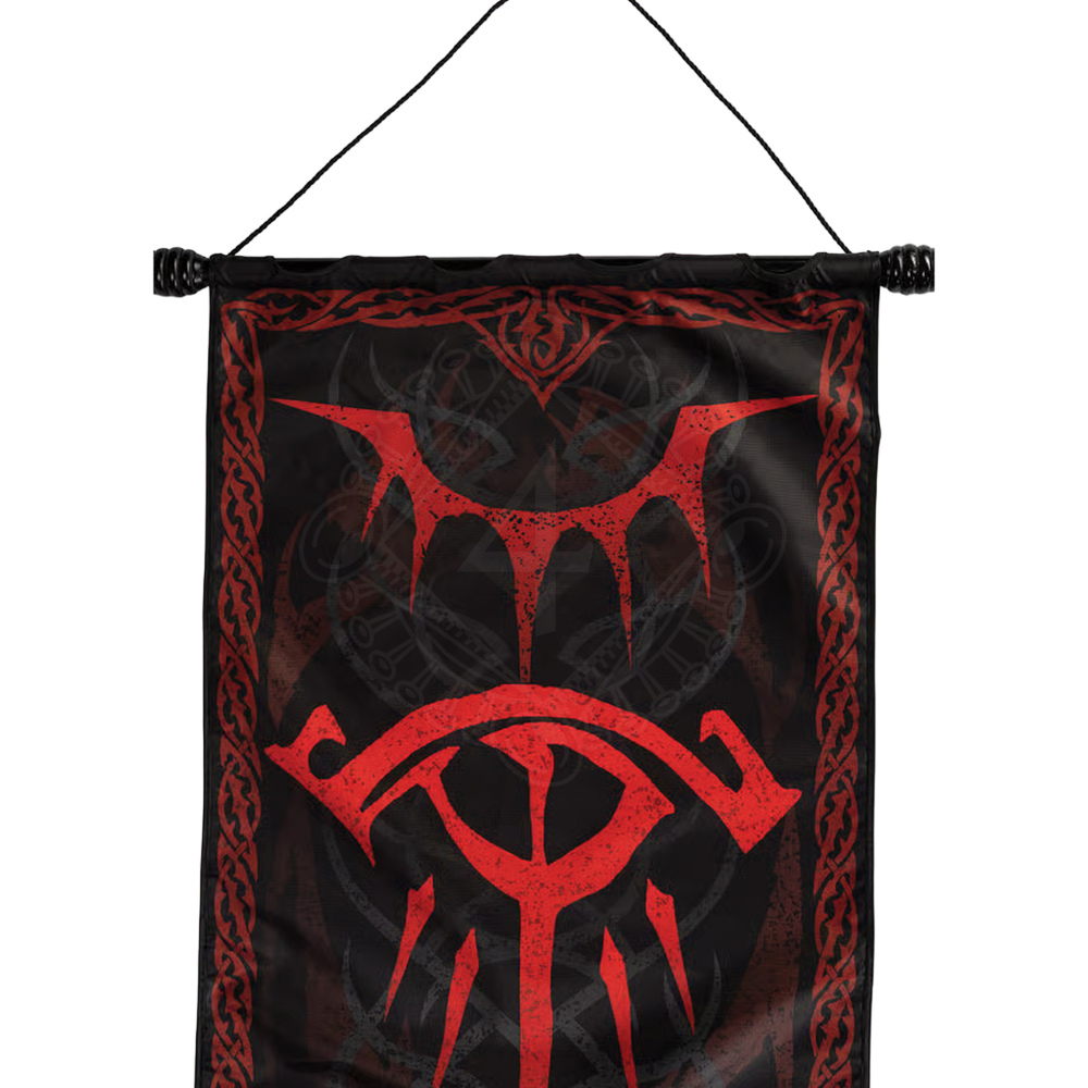 Im Zentrum dieses aus strapazierfähigem Nylon gefertigten Banners steht das Auge Saurons, umrahmt von blutroten Symbolen auf tiefschwarzem Grund. Das Banner besticht durch seine detailreiche Gestaltung und die intensiven Farben, die den bedrohlichen Look perfekt unterstreichen. Die Unterseite ist in drei markante Zacken geschnitten, was an die zerfetzten Standarten erinnert, die über den Ebenen von Gorgoroth wehen. Ein stabiler schwarzer Saum am oberen Ende dient als Tunnelzug für die einfache Montage.