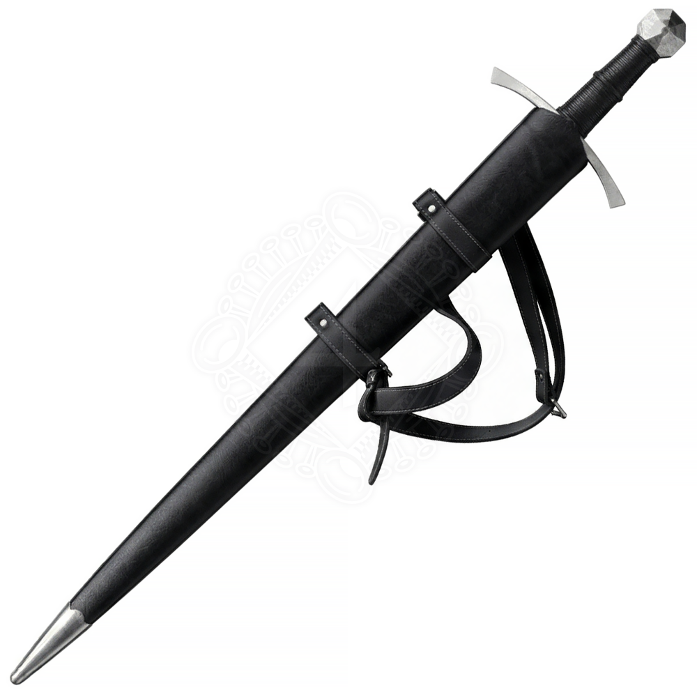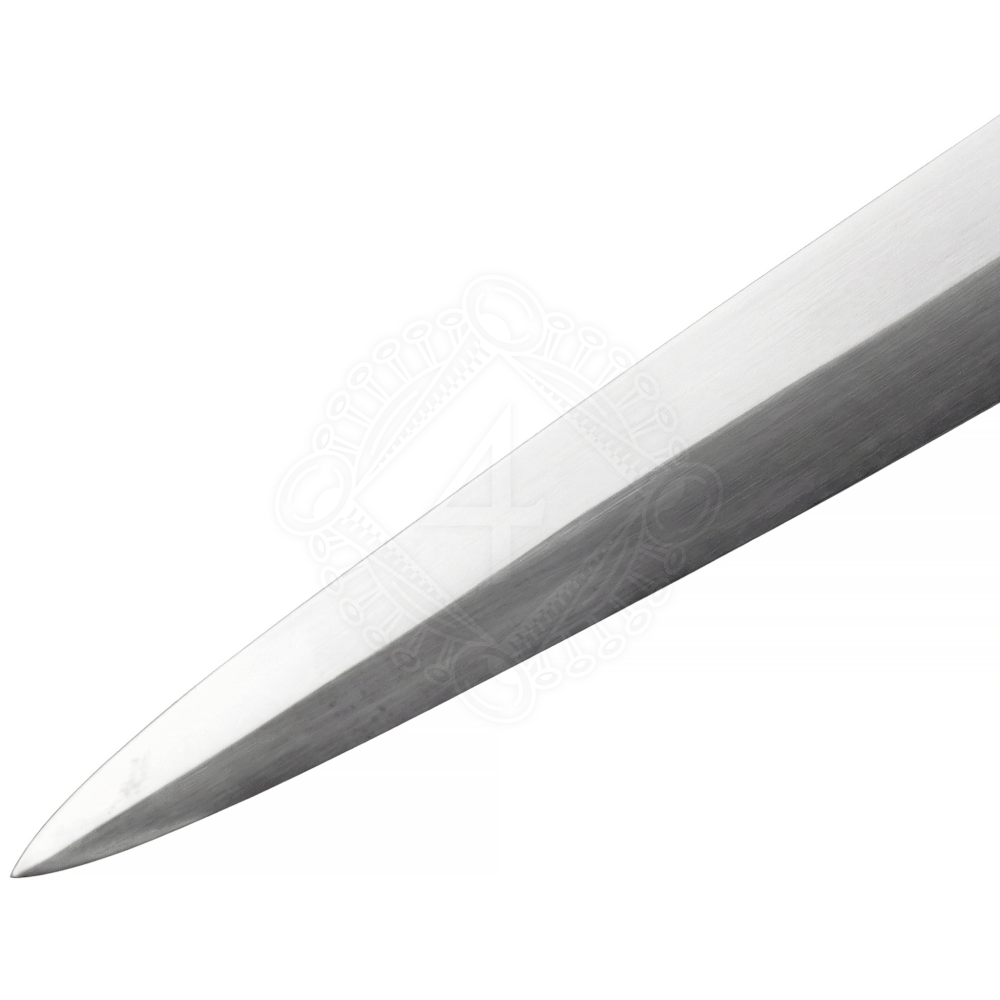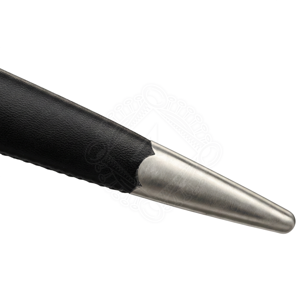 Dieses Schwert ist eine originalgetreue Nachbildung und entspricht der Oakeshott-Klassifikation Typ XIV. Dieser Waffentyp war im 13. und 14. Jahrhundert sehr beliebt. Sein Hauptmerkmal ist die breite Klingenbasis, die sich sehr stark zu einer scharfen und festen Spitze verjüngt. Das Schwert bot somit eine verheerende Hiebkraft, ermöglichte aber gleichzeitig ein effektives Zustechen in die Lücken von Kettenrüstungen oder frühen Plattenpanzern. Das Interessante an diesem speziellen Modell ist das Gefäß im Design des 15. Jahrhunderts (oft mit Fischschwanz- oder Scheibenknauf), was es zu einem faszinierenden Beispiel einer Waffe macht, bei der eine ältere, bewährte Klingenform auf eine modernere Griffergonomie trifft. Dies ist eine verbesserte Version aus der beliebten SWM-Serie. Die Klinge wird aus hauseigenem Federstahl präzise geschmiedet, wobei die Wärmebehandlung zur Sicherstellung höchster Qualität an spezialisierte lokale Werkstätten vergeben wird. Um den Preis attraktiv zu halten, ist der Griff mit einem Bezug aus strapazierfähigem Kunstleder versehen.