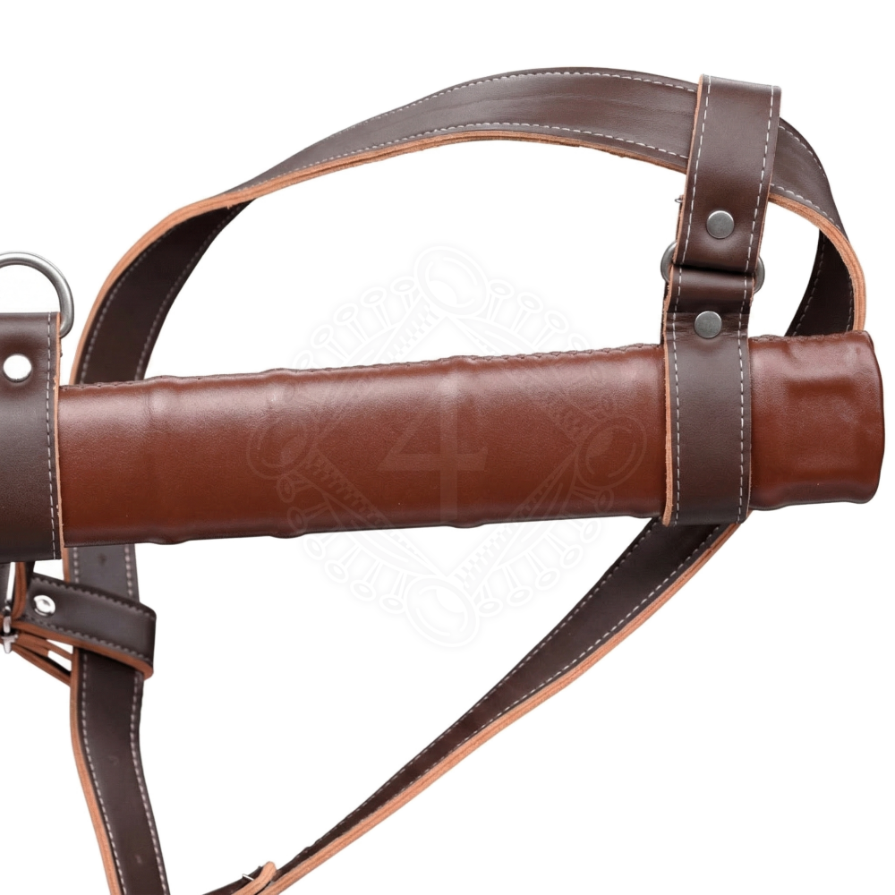 Das Heft besteht aus einem Holzkern, der mit vernähtem Kunstleder (PU-Leder) überzogen ist und einen sicheren Griff gewährleistet. Dasselbe Material umhüllt auch die zum Set gehörende Holzscheide, die über eine durchdachte integrierte Aufhängung für das Tragen über der Schulter oder am Gürtel verfügt. Die Metallelemente des Gefäßes – der massive, gelappte Knauf und die kurze Parierstange – sind aus weißem Kupfer (Neusilber/Alpaka) gegossen und mit plastischen, von historischen Artefakten inspirierten geometrischen Mustern verziert.