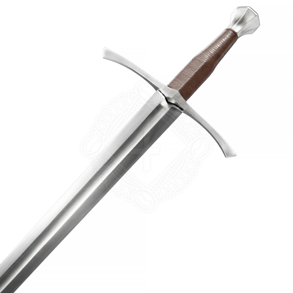 Die Klinge des Schwertes wird aus hochwertigem Federstahl geschmiedet. Die Waffe ist voll funktionsfähig und auf maximale Zuverlässigkeit ausgelegt. Der Wärmebehandlungsprozess dieses Modells wird aus Gründen der Qualitäts- und Mengenkontrolle an eine spezialisierte externe Werkstatt vergeben, dennoch wird eine hohe Widerstandsfähigkeit und eine Klingenhärte von 49-53 HRC garantiert. Um das Gewicht zu reduzieren und die Flexibilität zu verbessern, verfügt die Klinge über eine ausgeprägte breite Hohlkehle. Die Parierstange und der facettierte Knauf bestehen aus rostfreiem Edelstahl, was die Pflege erheblich erleichtert. Der Griff besteht aus einem massiven Holzkern, der mit braunem Kunstleder (PU-Leder) überzogen ist, das historische Materialien imitiert. Im Lieferumfang ist auch eine stabile Holzscheide enthalten, die mit demselben PU-Leder bezogen, mit einem geprägten Motiv verziert und mit einem praktischen Aufhängungsriemen ausgestattet ist.