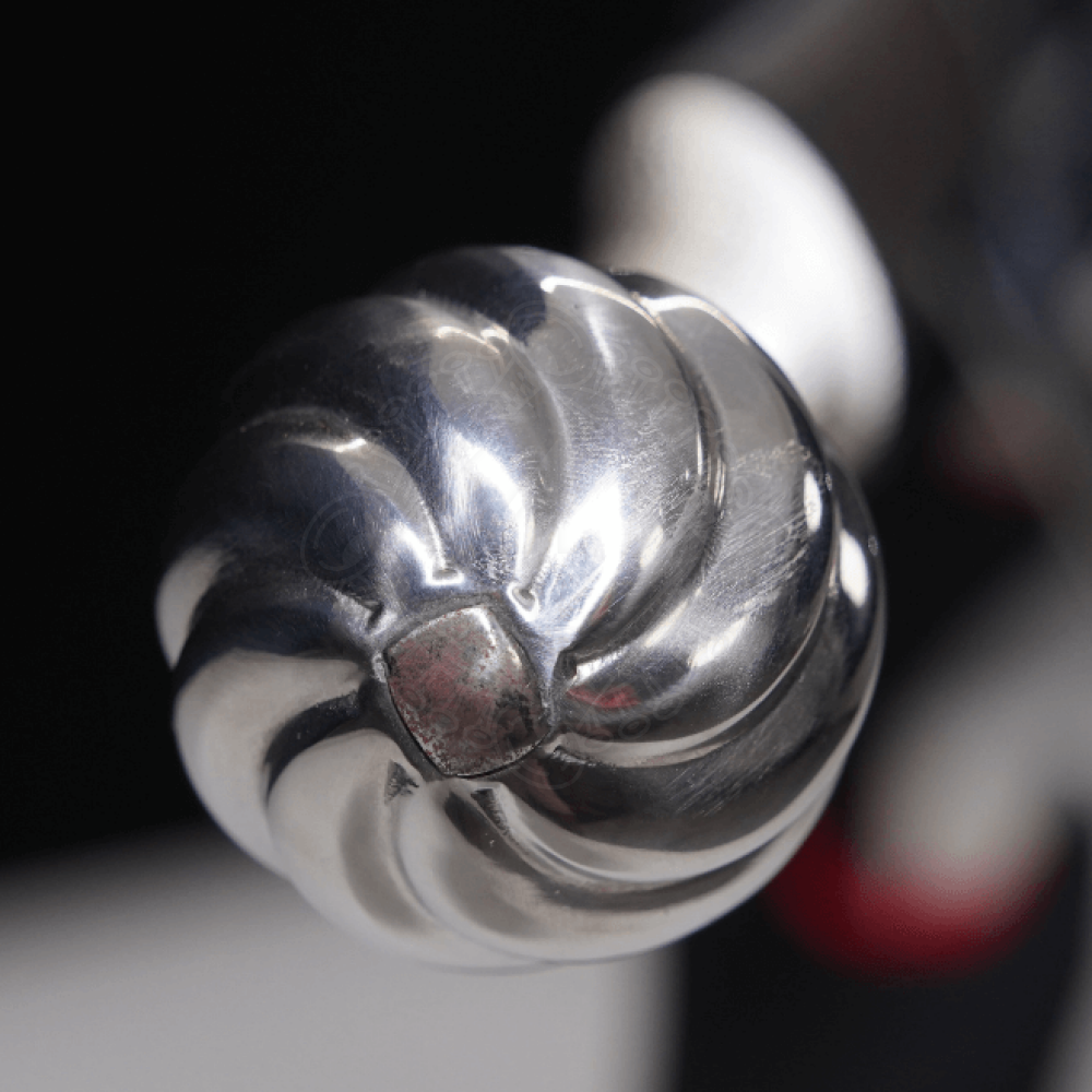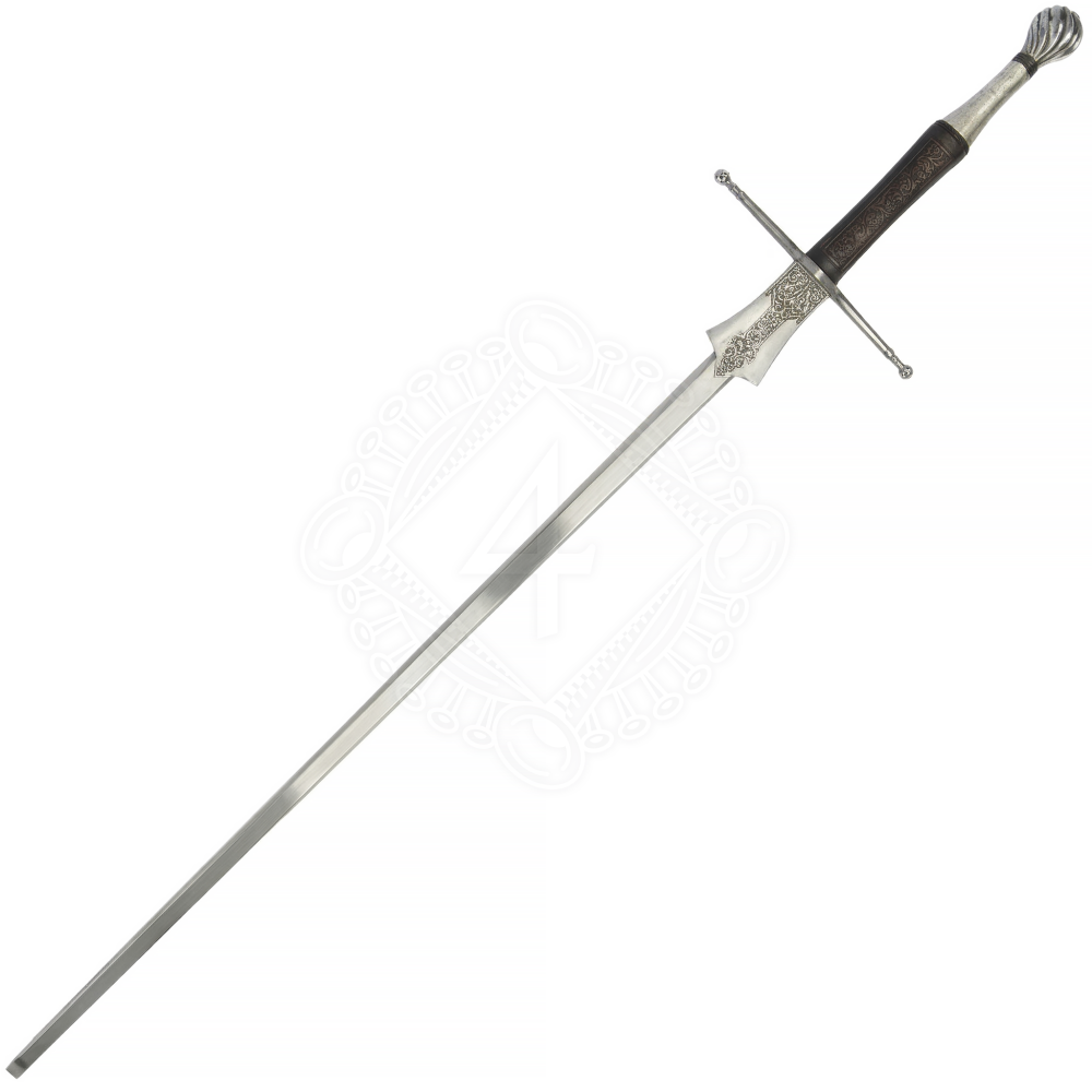 Das markanteste Merkmal der Waffe ist der verbreiterte Schilt, der mit einer tiefen und komplexen floralen Gravur verziert ist. Der Griff kombiniert einen festen Halt durch einen schwarzen Lederbezug mit einer eleganten Umwicklung aus silberfarbenem Draht im oberen und unteren Bereich. Das gesamte Gefäß wird von einem massiven, spiralförmig gedrehten Birnenknauf abgeschlossen, der das Schwert perfekt ausbalanciert. Die gerade Parierstange hat Enden, die elegant zu Spiralen geformt sind, was gestalterisch mit der Form des Knaufs harmoniert.