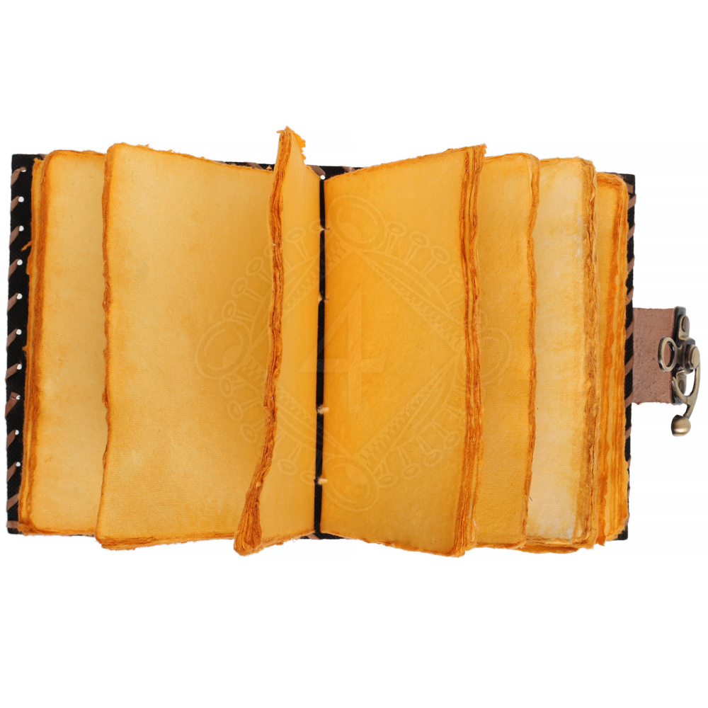 Der Innenblock besteht aus natürlichem Büttenpapier mit einer typischen Struktur und ockerfarbenem Touch. Da es sich um handverarbeitete Naturmaterialien handelt, können der Farbton des Leders und die Textur des Papiers leicht von den Fotos abweichen. Jedes Stück ist dadurch ein absolutes Unikat.