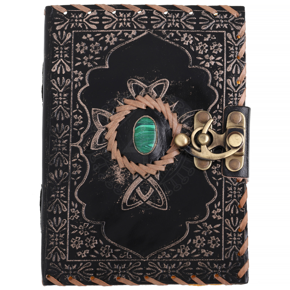 Schwarzes Leder-Grimoire mit grünem Halbedelstein und keltischer Prägung