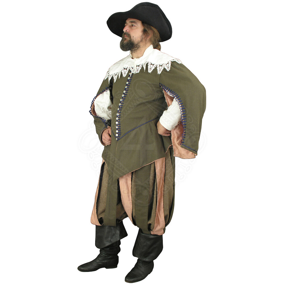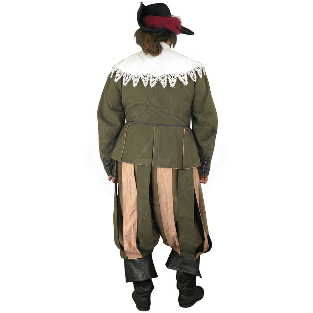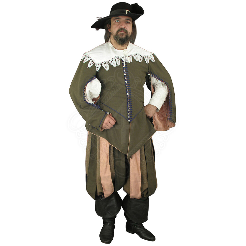 1xDer Herrenanzug im Stil des dreißigjährigen Krieges besteht aus einem Hemd, einem Wams und einer Hose. Das Hemd hat lange enge Ärmel und einen leinen Kragen mit der Spitze. Das Wams hat verlängerte Schöße, den Knopfverschluss und lange Ärmel, die man mit den Knöpfen knopft. Die Hose längt bis zu den Waden. Zum Kleid gehört auch ein Filzhut mit breitem Saum. Weitere Produktinformationen ...