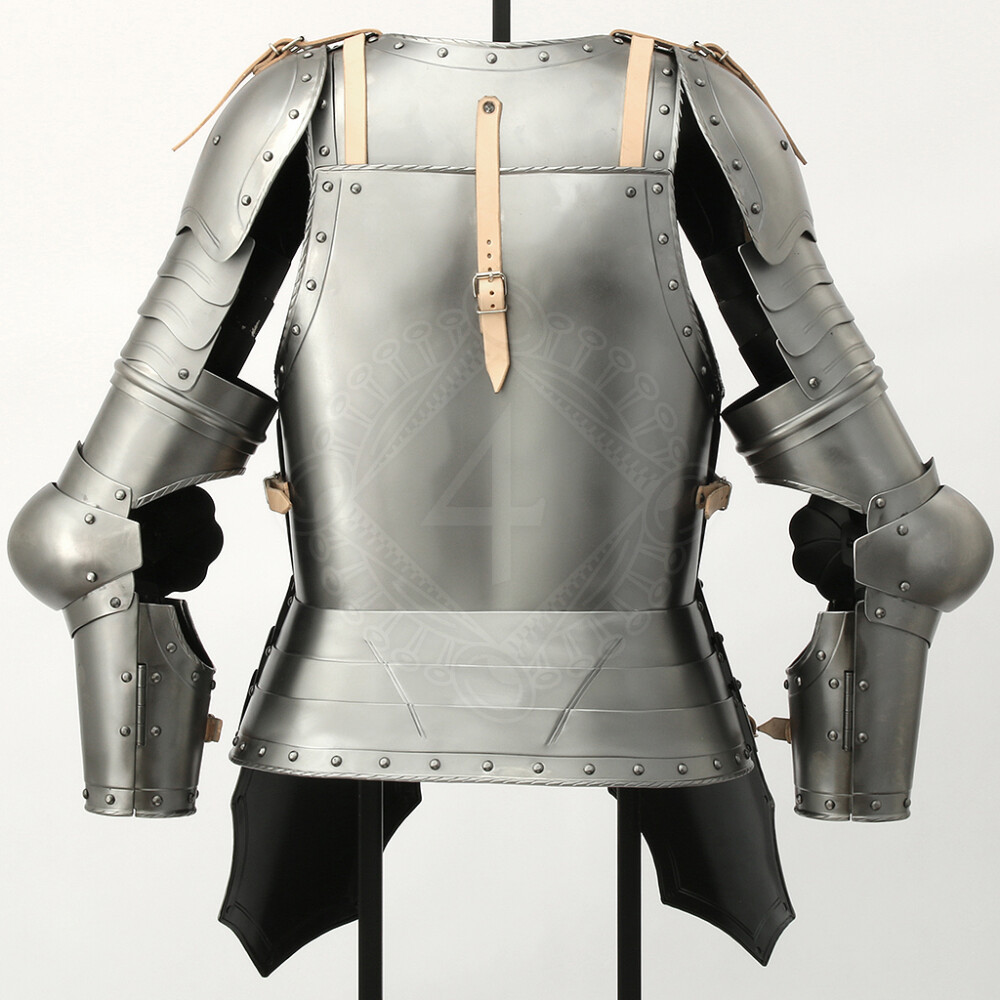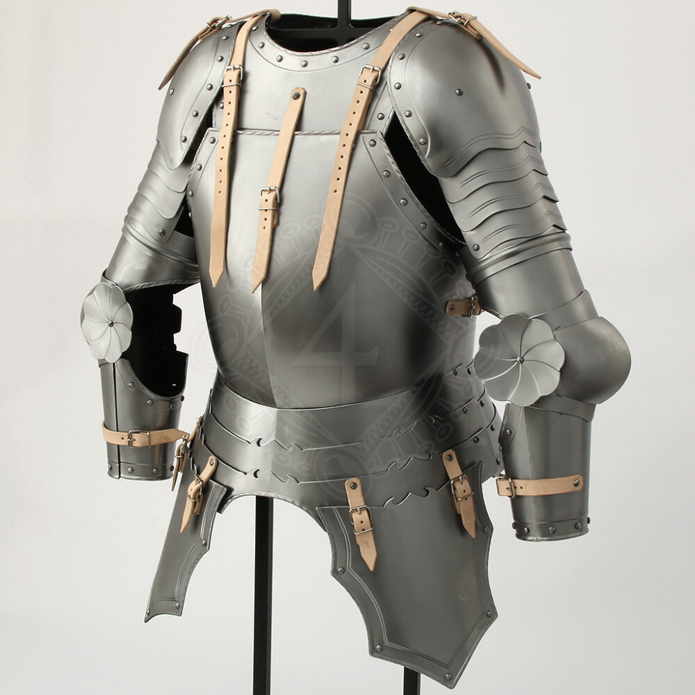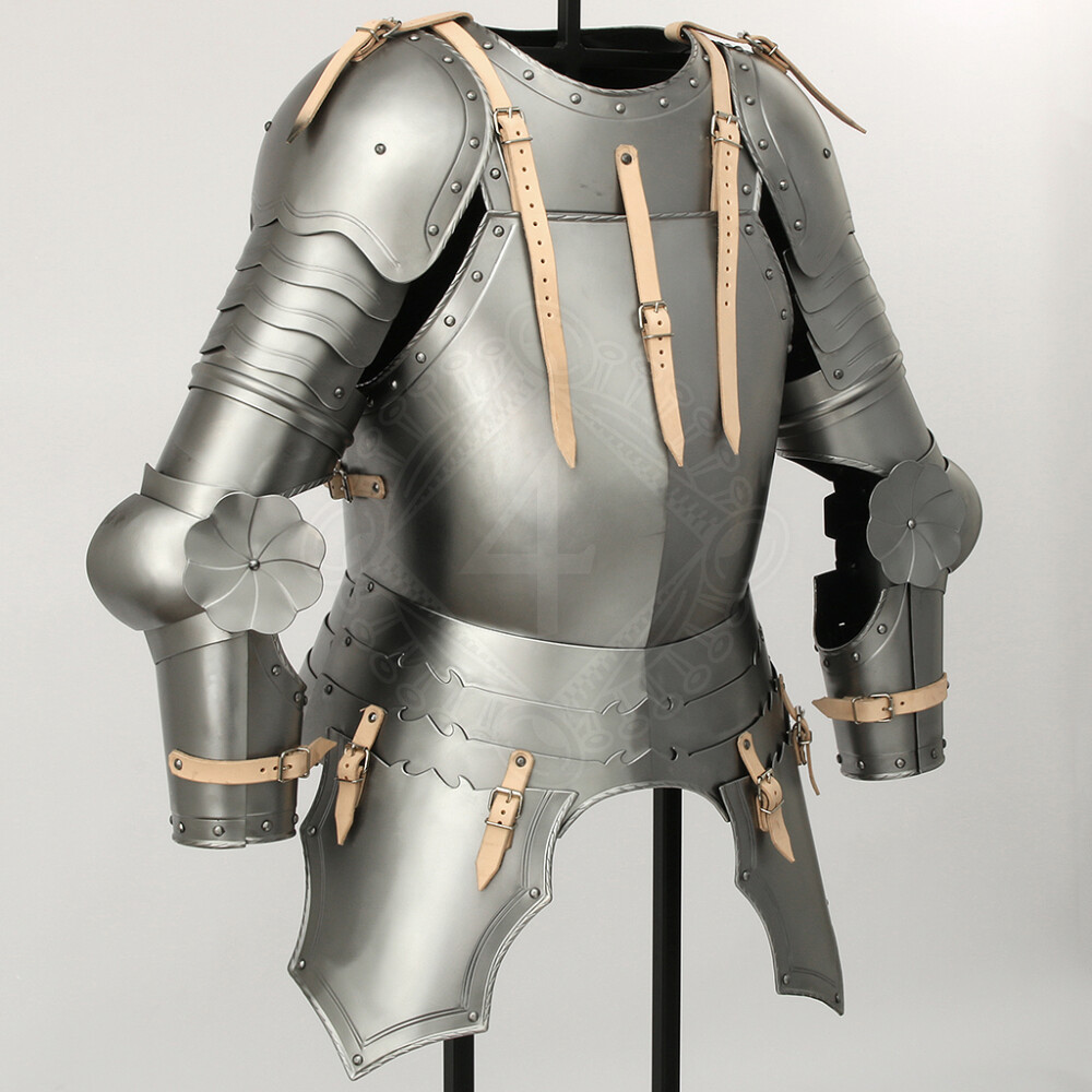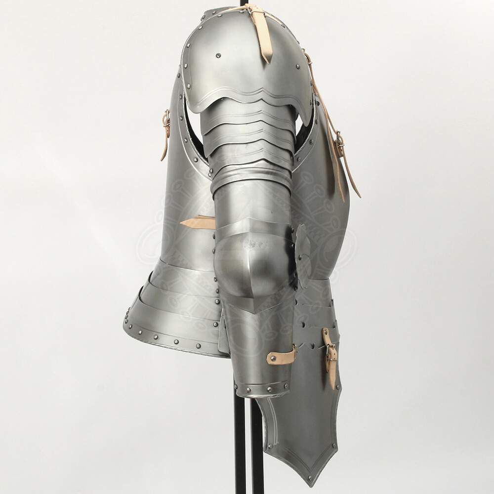 Die einzelnen Teile sind mittels Lederriemen und Schallen zusammen verbunden. Diese mittelalterliche Halbrüstung wird genau nach Maß laut dieser Maßtabelle hergestellt. Wählen können Sie aus zwei Materialstärken und mehreren Oberflächenverarbeitungen.