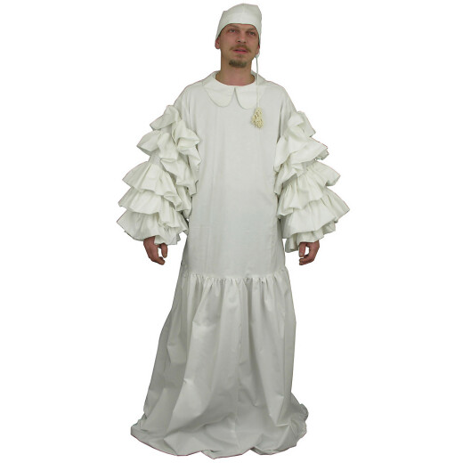 Dieses Hemd ist als Nachtkleid für Ratsherren sowie vornehme Schöffen geeignet. Die Schlafmütze mit Troddel hält auch bei strengem Frost warm. Das lange Nachthemd hat bequeme, weite und kaskadenförmige Ärmel. Die Faltung ermöglicht ein bequemes Gehen. Weitere Produktinformationen ...