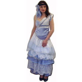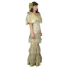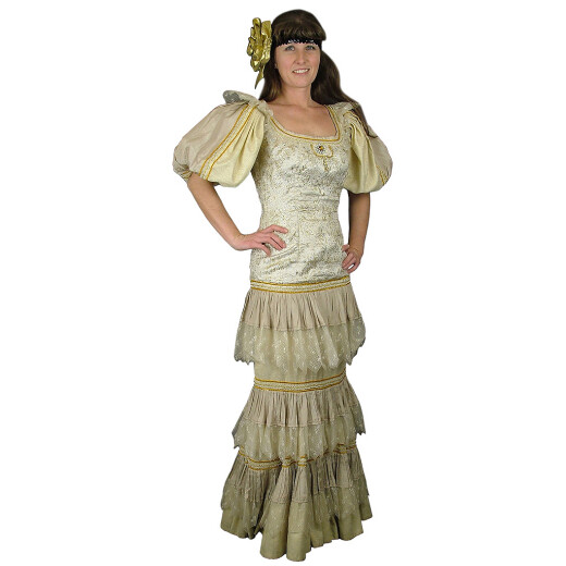 Das Damenkleid ist vom Brokat abgenäht. Der Corsage längt bis unter dem Niveau der Taille und hat ovale Dekolleté und kurze puffige Ärmel. Der Rock längt bis zur Erde und ist mit den Spitzenkaskaden verziert. Zum Kleid gehört ein Haarband mit einem Blumenmotiv. Weitere Produktinformationen ...