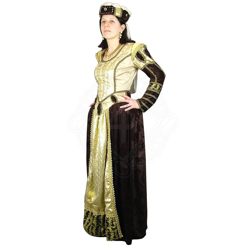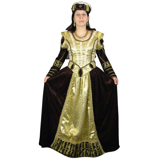 Dieses Italienische Renaissance Kleid ist aus Samt und Brokat hergestellt. Im enganliegenden Mieder mit zierlichen Aufschnitten ist ein Rock gerafft. Die Ärmel sind geteilt, der bauschige Teil ist gleich wie das Mieder geschlitzt. Zur Kleidung wird ein stilvoller Hut mit Schleier mitgeliefert. Weitere Produktinformationen ...