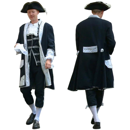 Der Herrenanzug im Stil des Hochbarocks besteht aus einer Jacke, einem Wams und einer Hose. Die Jacke hat Knopfverschluss und längt bis zur Taille. Űber die Jacke zieht man das Justaucorps-Wams mit langen Ärmeln und Ziersäumen an. Rund dem Hals ist Fichu. Die enge Hose längt bis zu den Waden. Zum Kleid gehört auch ein Dreispitz. Weitere Produktinformationen ...